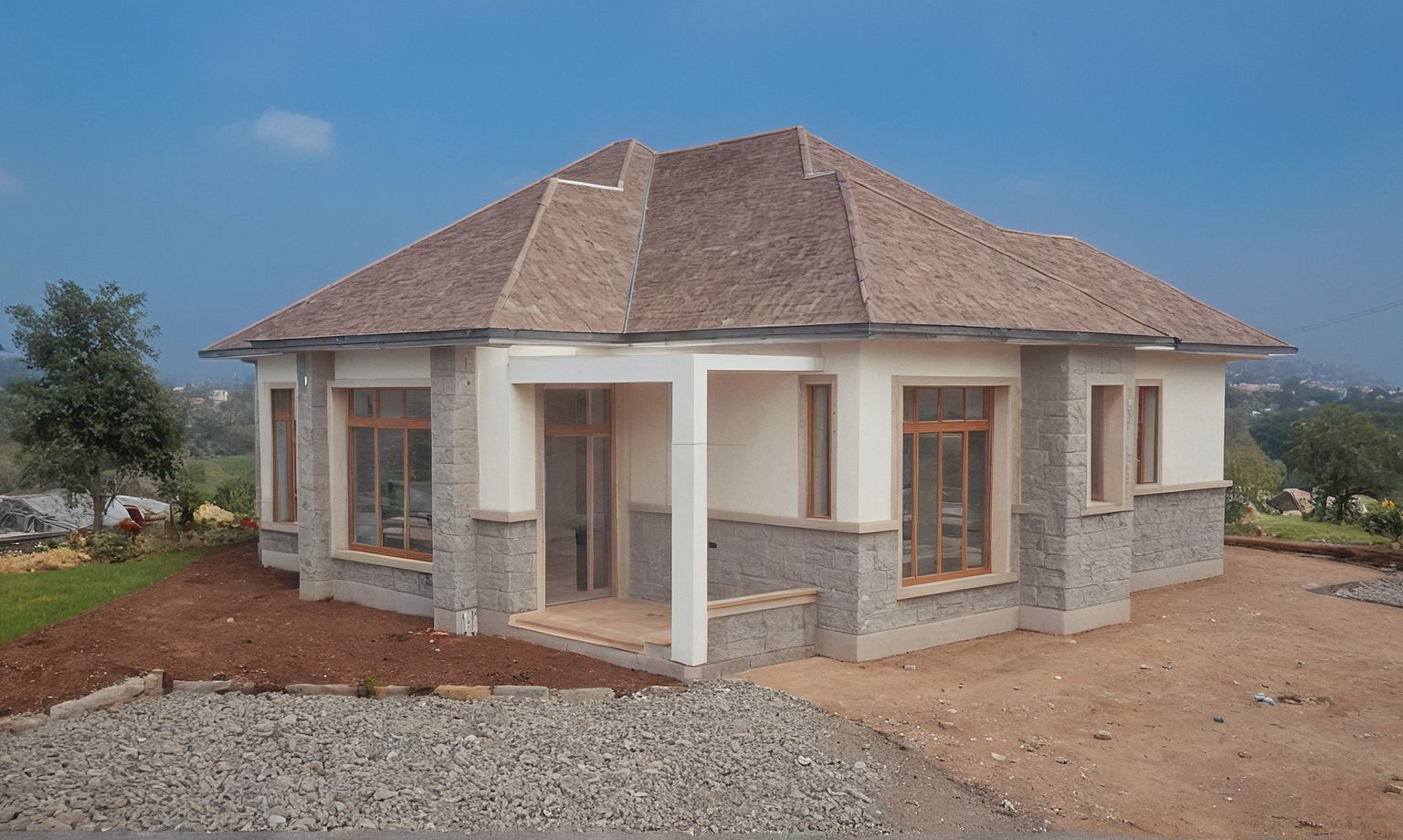 PromptPhoto of a modern single-story residential house featuring a unique angular roof design and welcoming entrance. Emphasize textured stone walls paired with smooth plaster surfaces, large windows for natural light, and wooden accents. The house is set in a suburban neighborhood, surrounded by green landscaping and nearby trees. Captured in soft evening light, casting gentle shadows, enhancing architectural details. Use a low-angle perspective to emphasize the facade with a wide lens to include the setting and foreground elements.