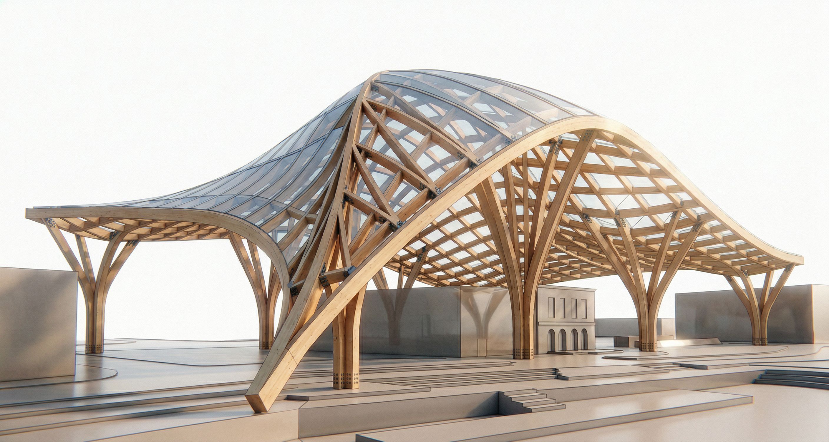 PromptRefine and correct this 3D timber roof structure to make it structurally realistic and logically organized. Main corrections Simplify the structure into a clear hierarchy Reduce the number of primary ribs to 3–4 main structural arches Define one main central structural spine and a few secondary branches Structural logic Align all branching columns directly under main load-bearing ribs Every column must clearly support a primary or secondary beam Remove any elements that do not clearly transfer loads Diagonal arch Rework the large diagonal arch: either connect it clearly to a column and make it a main load-bearing element or simplify/remove it if it has no structural logic Secondary structure Keep a lighter secondary grid between main ribs Reduce density of the grid toward the edges Make the structure denser and stronger above the main building Make it lighter and more open toward the outer canopy Gradation Create clear structural gradation: strongest and tallest elements above the main hall lighter structure toward the edges and over the outdoor market Columns Use fewer but stronger branching timber columns Place them mainly along the perimeter Keep interior space open Geometry Keep the original flowing roof shape Maintain the overall footprint and direction toward the river Do not redesign the form, only improve structure Output style architectural 3D structural model clean white background light wood material no people no textures no labels focus on structural clarity Important the result must look buildable and realistic not a freeform sculpture clearly readable load paths and hierarchy, keep exact camera angle