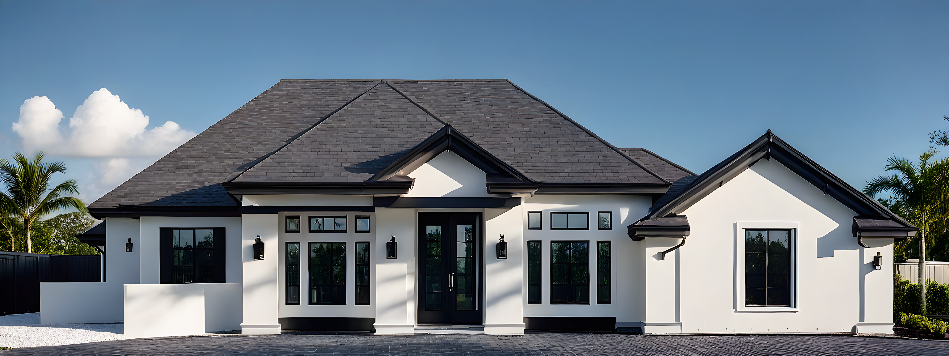 PromptModern home with black window trim, charcoal tile roof, circle paver driveway and florida landscape