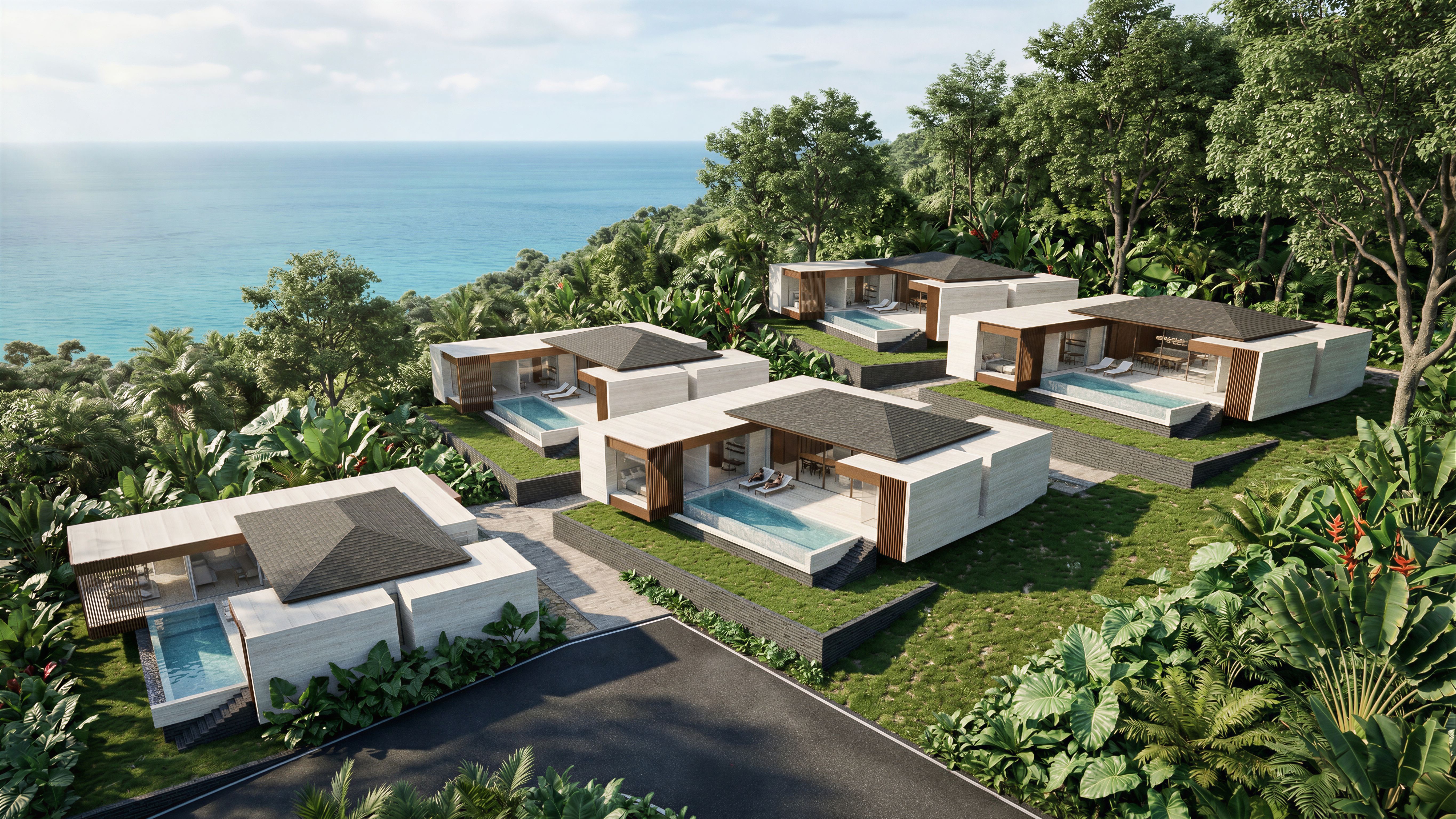 EnhancedPromptA photorealistic architectural rendering of an ultra-luxury minimal villa on a Koh Samui hillside. The design features a seamless use of White Travertine stone for walls and floors, extending directly into an infinity-edge pool. Structural beams and vertical slats are made of bronze. The building's base and retaining walls are constructed from dark grey bricks. Large Vitrocsa sliding window systems with ultra-slim frames reveal a central living/dining area flanked by bedrooms. The roof is finished with asphalt shingles and grey asphalt waterproof membrane for flat roofs. The very dark grey asphalt road leads to each villas along the green grass hill and tropical plants on the sideway. The villa is part of a tiered branded residence, stepped down the slope to ensure unobstructed panoramic sea views. The environment is lush with diverse tropical greenery and large native trees between villa plots and in the foreground and background. Bright, soft morning sunlight casts elegant dappled shadows across the grassy slopes. Note: Absolutely no coconut trees, only large native tropical foliage. 8k resolution, cinematic lighting., keep exact camera angle, keep exact camera angle, keep exact camera angle, keep exact camera angle