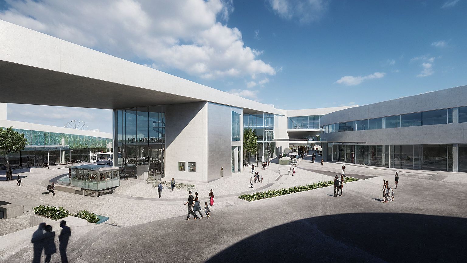 Promptdaytime social district proposal Turn on indoor lights for warmth. Add realistic vegetation and people where appropriate. Emphasize the materials of glass plaster and concrete with accurate textures and reflections. Improve lighting, shadows, and overall atmosphere for a vivid, lively, and cohesive look. the little trin carts are kiosks.