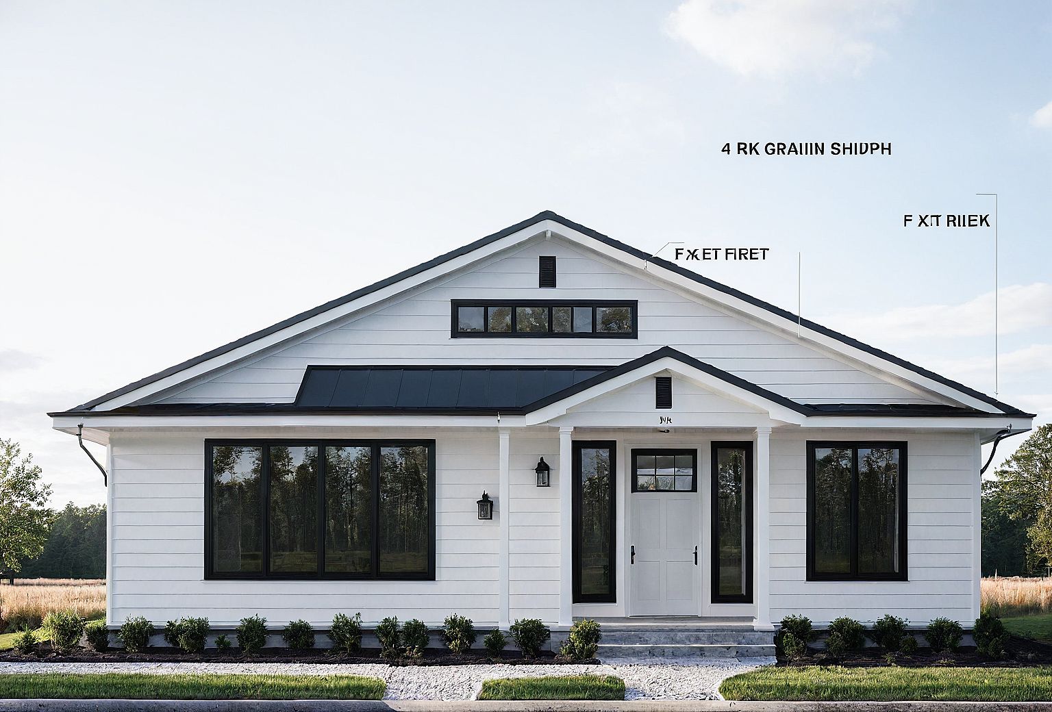 left sid eof house is 5 feet pop out than where the front door islocated and the right side is 5 feet deep from front door and that rihts ide has a porchthis is a 1 story house - white shiplap black composite roof white french windows
