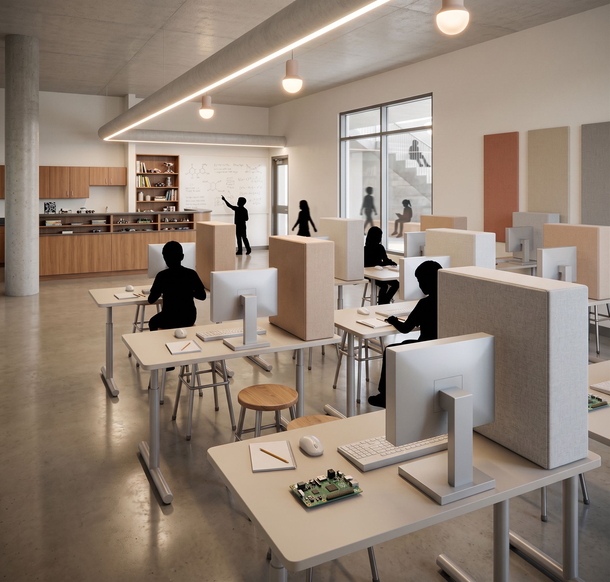 PromptEnhance this architectural interior rendering while keeping the EXACT geometry, camera angle, proportions, and all object placement unchanged. Do NOT modify, move, add, or remove any architectural elements, furniture, or layout. Only apply materials, lighting, and atmosphere. STYLE: Enscape-style realistic rendering with subtle Photoshop post-processing. Clean, minimal, architectural realism. LIGHTING: - Soft natural daylight coming from windows and glass door - Warm interior ambient lighting (3000K–3500K) - Add linear ceiling light glow where indicated (blue lines) - Add subtle pendant lights (pink markers) with warm soft glow - Soft shadows, no harsh contrast MATERIALS (VERY IMPORTANT): - Ceiling: exposed concrete slab (light gray, smooth, slight texture) - Column: round exposed concrete column (match ceiling tone) - Floor: polished concrete (subtle reflection, slightly warm gray) - Tables: light neutral laminate or light wood - Stools: wood seat + metal legs - Desk partitions: soft fabric acoustic panels (beige/light gray) - Casework (back wall): warm wood cabinetry - Wall: painted gypsum (off-white warm tone) ACOUSTICS: - Add vertical acoustic wall panels on right wall (3–4 panels, muted tones: terracotta, beige, gray) - Optional subtle ceiling acoustic panels (thin, minimal) STEAM PROGRAM DETAILS: - Keep all desks EXACTLY as placed - Add: - computers ON desks (thin monitors) - keyboards + mouse - notebooks, pencils, small objects - Back wall: - whiteboard with light STEAM diagrams (science, math sketches) - shelves with books + materials GLAZING / CONNECTION: - Glass door/window must remain EXACT - Through glass: show learning stair space (slightly blurred depth) - Add 2–3 silhouettes on stair visible through glass PEOPLE (VERY CONTROLLED): - Use ONLY black silhouette children - Keep scale appropriate (middle school) - Placement: - 3–4 seated at desks - 1 standing at whiteboard - 1 walking near glass - DO NOT overcrowd ATMOSPHERE: - Clean, calm, focused learning environment - Slight depth haze - Balanced composition POST-PROCESSING (PHOTOSHOP STYLE): - Slight contrast boost - Warm highlights, neutral shadows - Subtle vignette - Light sharpening - Very minimal grain IMPORTANT: - DO NOT change geometry - DO NOT move furniture - DO NOT redesign anything - ONLY enhance materials, lighting, and life, keep exact camera angle