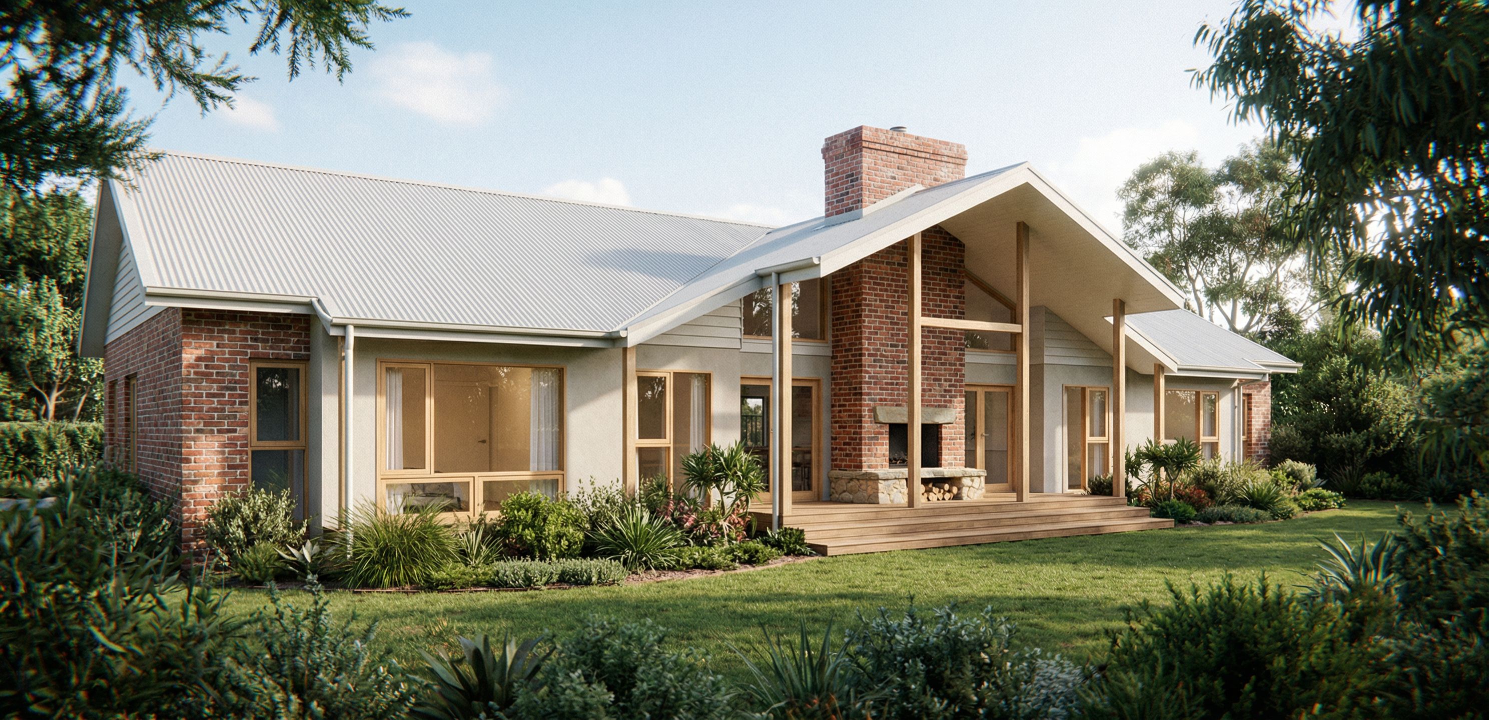 Create a photorealistic rendering of this house, with a mix of weatherboard, render and red brick to the facade as shown. Make sure to use realistic textures. Where there is no brick, colour is to be Colorbond "Surfmist". Window frames are to be light oak, keep exact camera angle