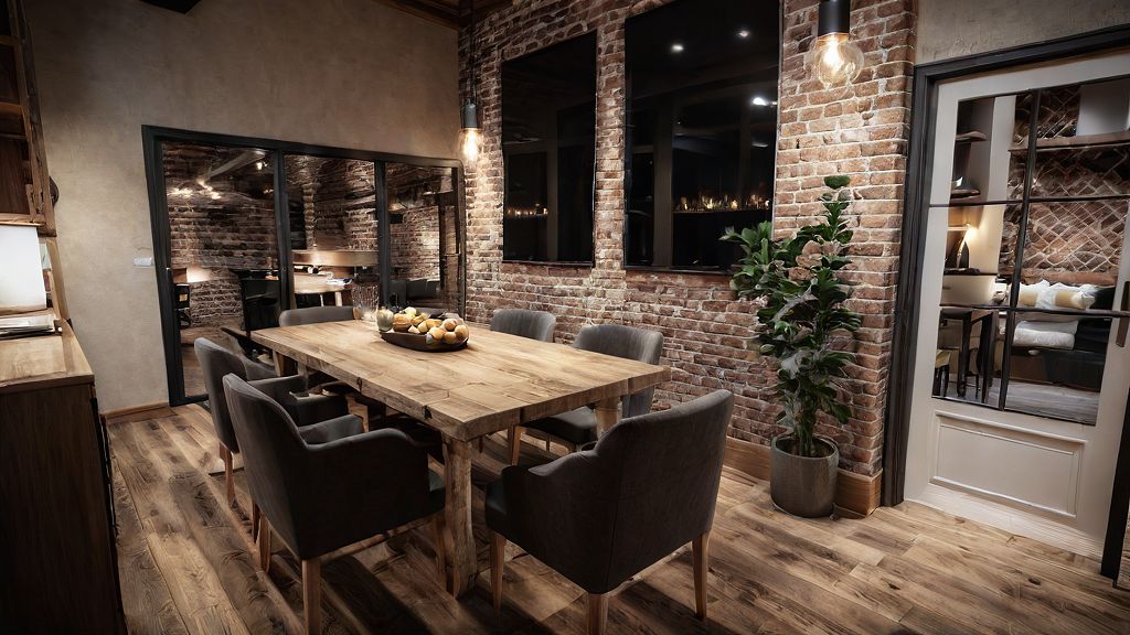 Promptthis is the dining room of a cozy house, the interior has exposed brick walls, warm and soft lighting. there are many wood textures. the style is a mix between rustic and contemporary.