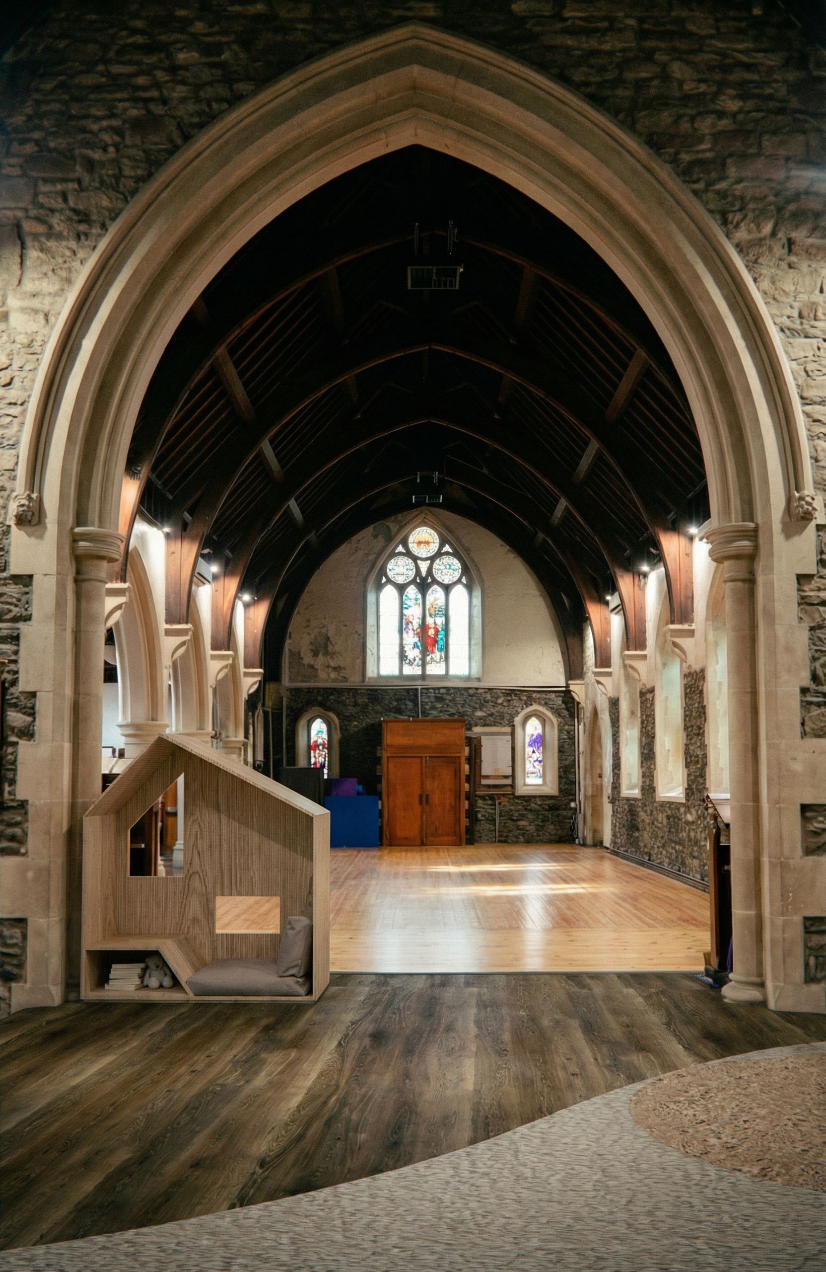 add cotext of the church roof and stainglass window and the timber floor contrast from the chancel to the mian church space, keep exact camera angle