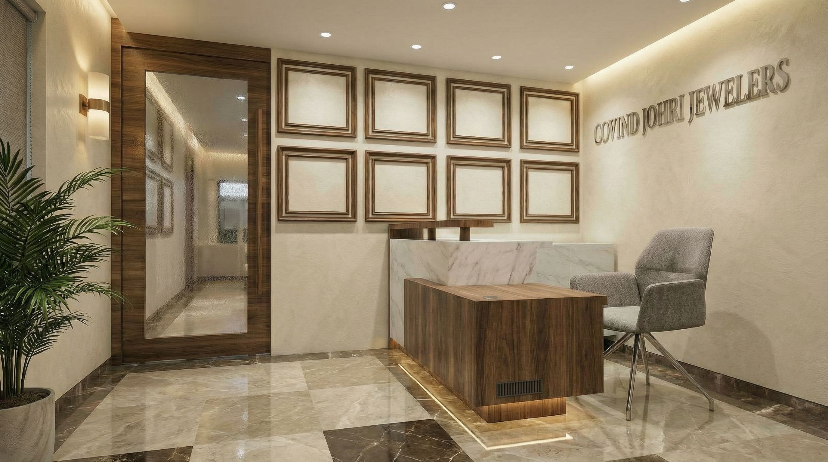 interior design rendering, render this 3D mass into photorealistic rendering, interior design rendering, render this 3D mass into photorealistic rendering, Photo of an interior jewelry showroom featuring a modern reception desk with a combination of warm wood and sleek marble materials. Walls adorned with empty wooden frames give a bespoke feel. The space is illuminated by soft ambient lighting, enhancing the textures of the surfaces. Shot from a slightly elevated angle to capture the reception area with the elegant chair facing the desk, using a 35mm lens to provide depth and focus on design details. The overall ambiance suggests luxury and sophistication within an urban context. flooring is two coloured italian marble one being beidge and other being armani brown , keep exact camera angle, high quality, professional, detailed scene, keep exact camera angle, high quality, professional, detailed scene