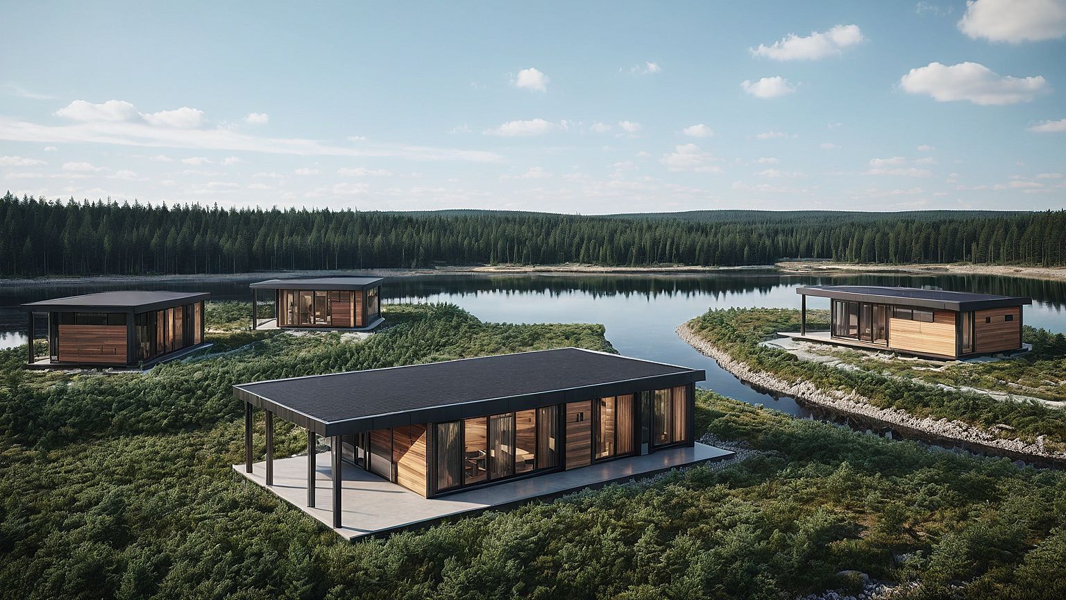 PromptSeveral modern minimalist high-tech houses surrounded by a tall coniferous forest with a river