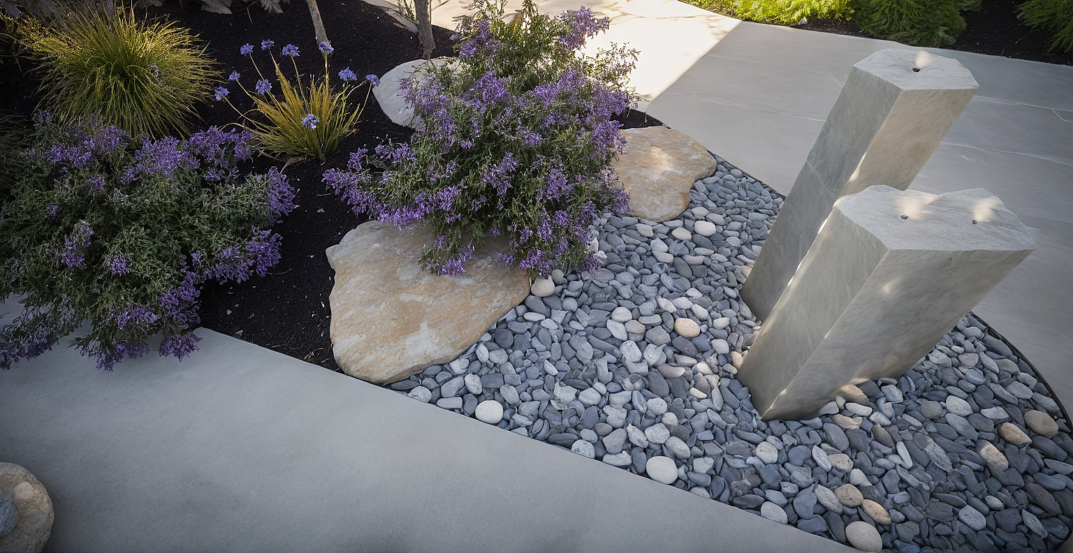 Promptenhance, water fountains, flagstone patio, lilac, birch trees, black-eyed susan, juniper, asters, landscaping, white furniture, blue fescue