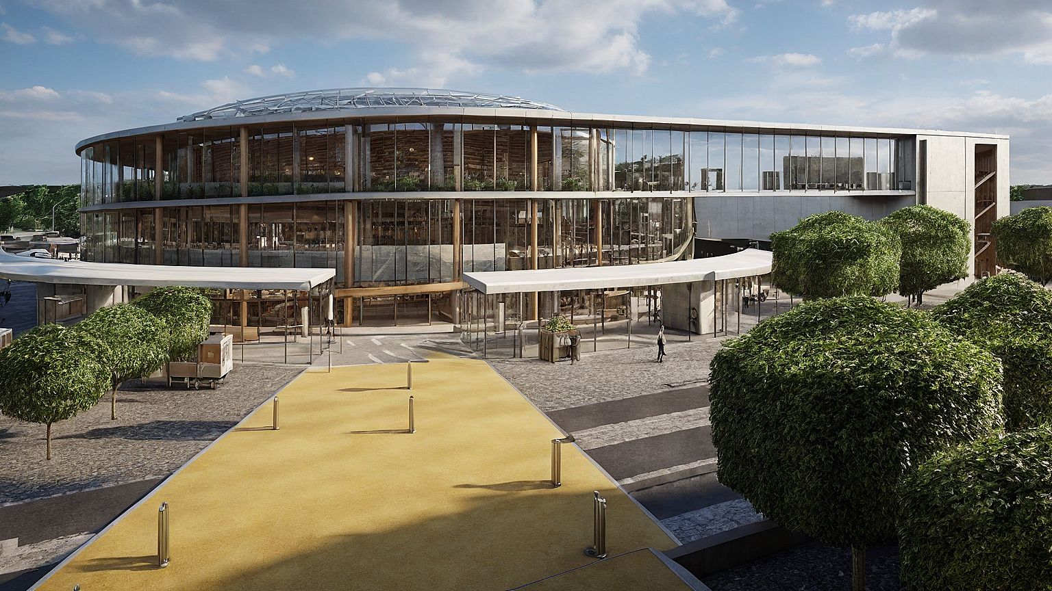 daytime social district proposal Turn on indoor lights for warmth. Add realistic vegetation and people where appropriate. Emphasize the materials—glass, concrete, and plaster—with accurate textures and reflections. Improve lighting, shadows, and overall atmosphere for a vivid, lively, and cohesive look. This area has cafes and restaurants. Add people sitting in the chairs. signage and the train carts are kiosks. Keep all straight lines straight. make facade plaster.