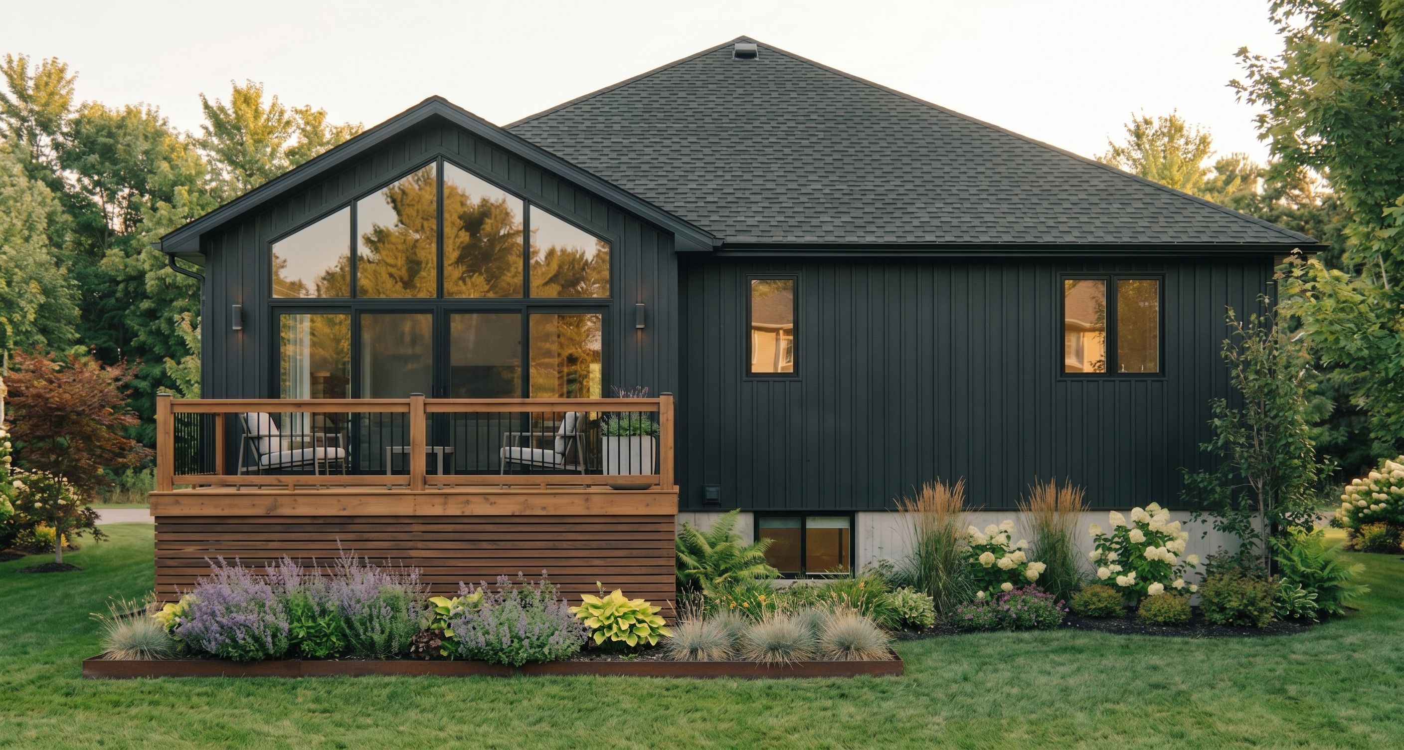 PromptRemove the flowers under the deck and add modern deck skirting, add a flower bed infront of the deck and remove some foliage infront of the basement window, keep exact camera angle