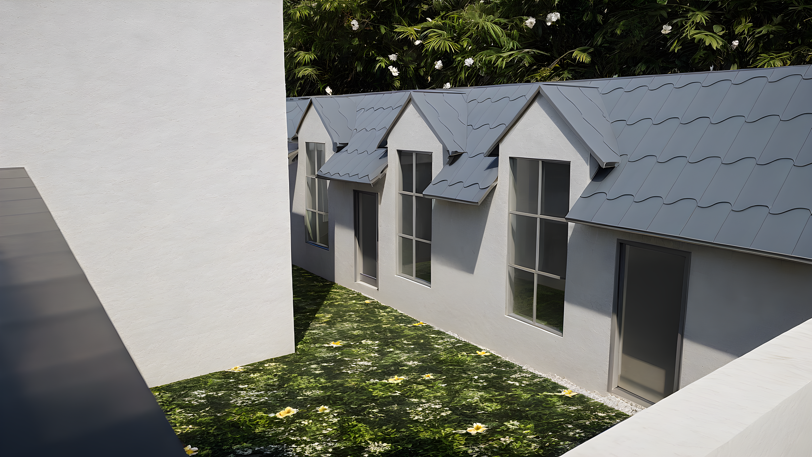 Building is a bungalow meant for an office and a training room. Wall color to be white and grey. Add interior warm lights and exterior wall lights. External floor to be heavy duty tiles. Use tropical flowers and greens. Glass windows to be nice. Roof grey, nice tropical clouds.