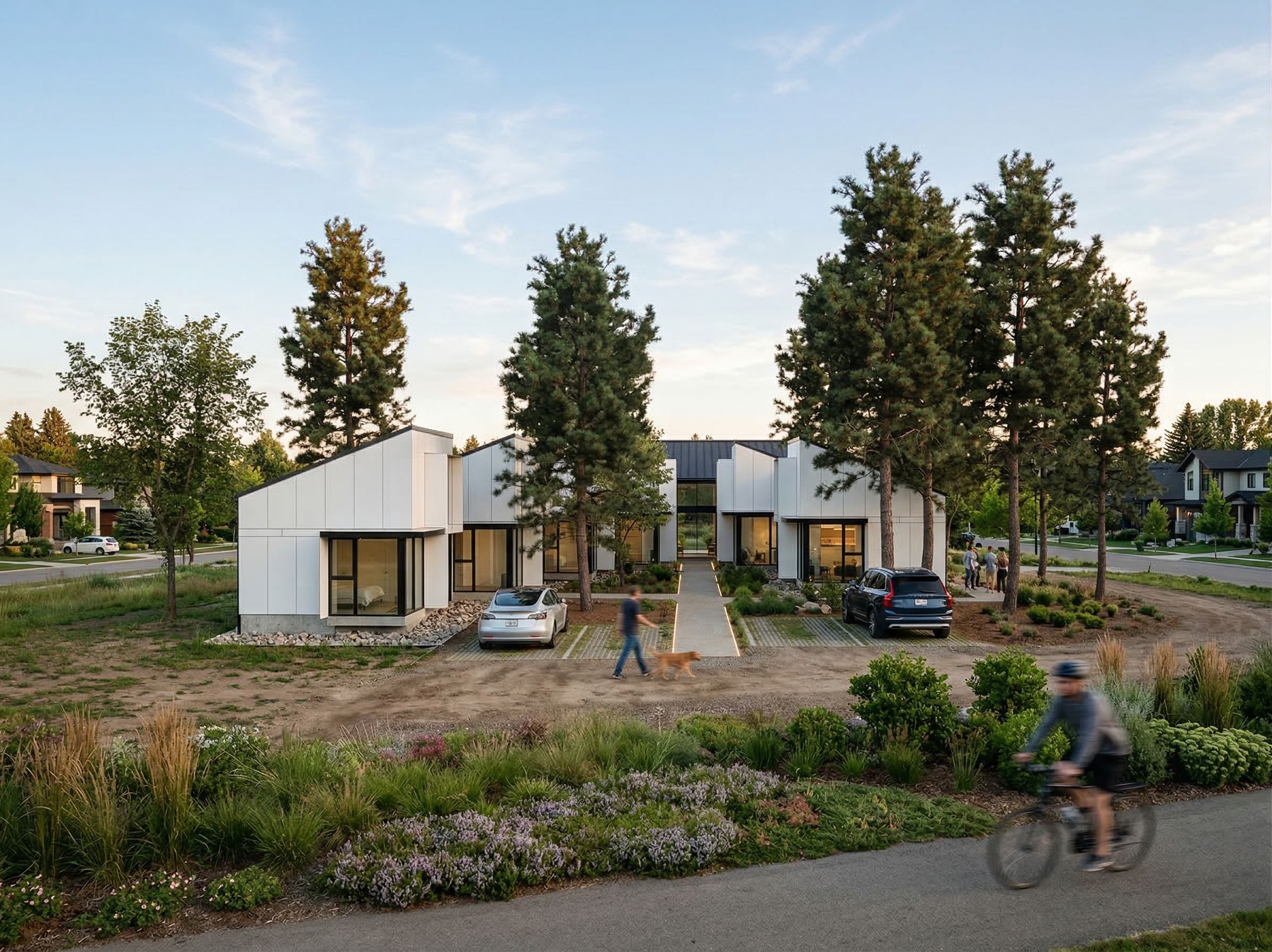 Promptvery modern, white metal panels, black frame glazing, situate in suburban neighbourhood, keep exact camera angle