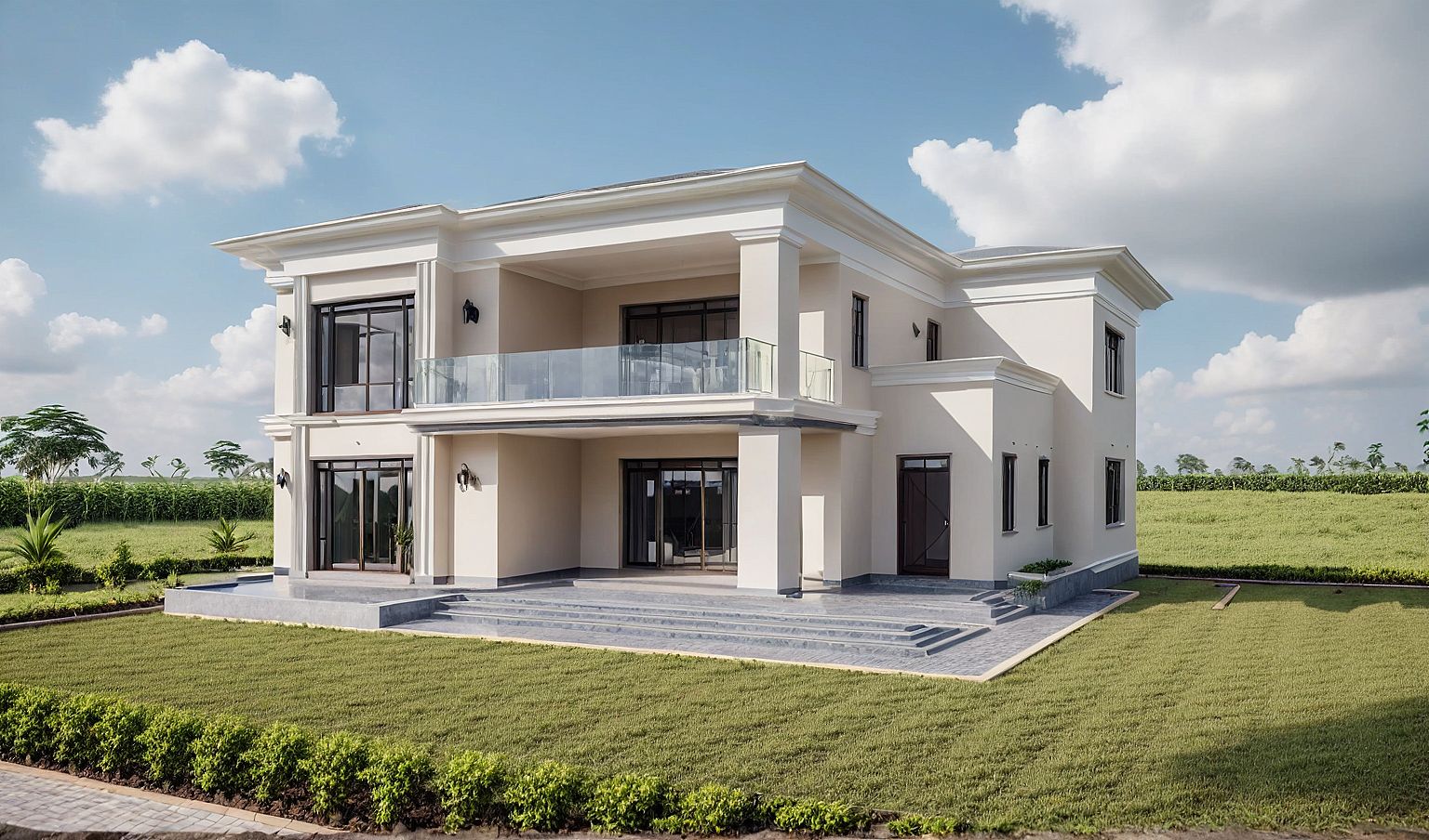 Modern neoclassical home in uganda with bright neutral tone and manicured landscaping no pool and a bright dramatic sky