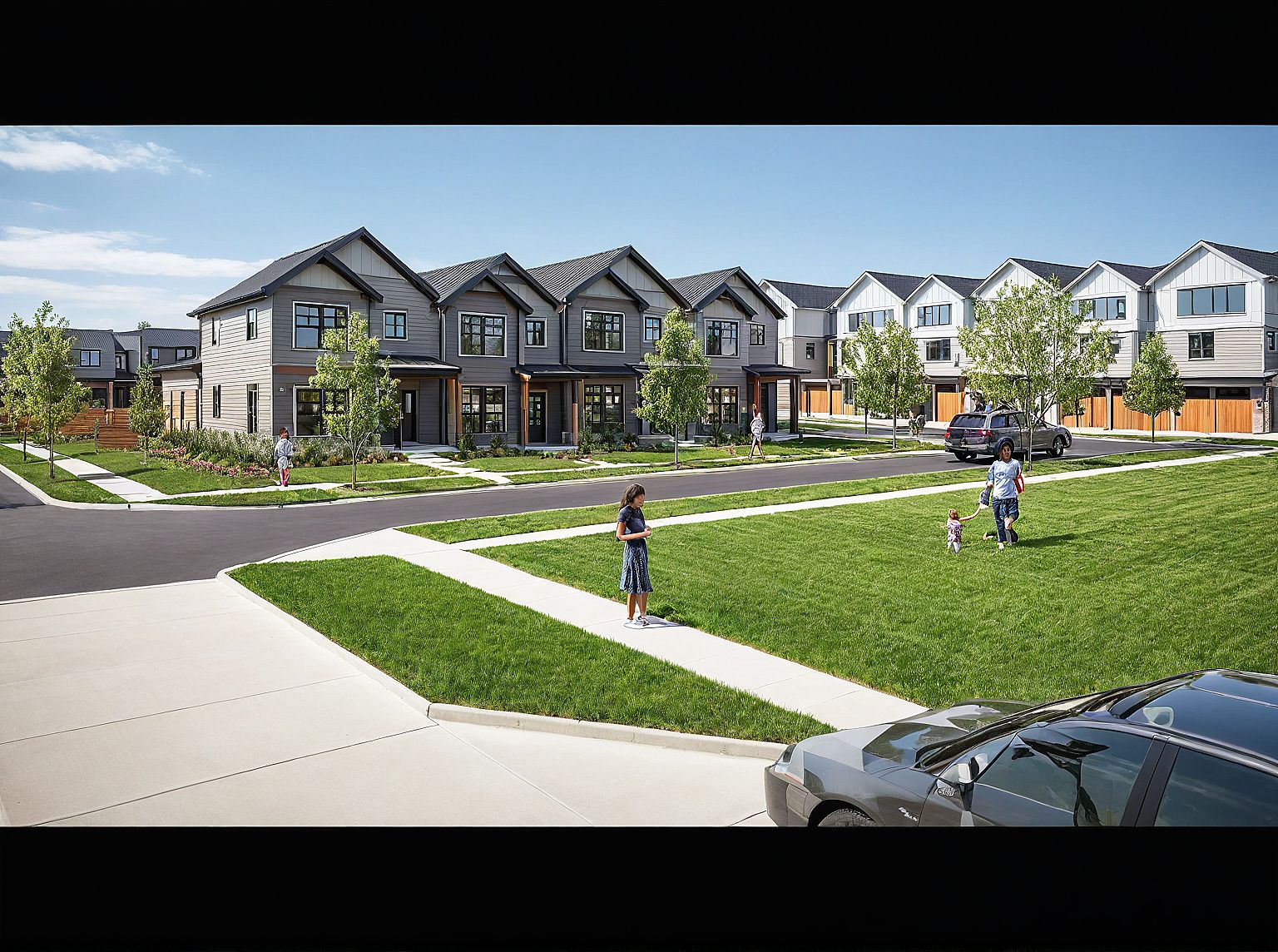 PromptPhoto of residential townhouses in a suburban setting, featuring modern facades with detailed trim and varying textures. The greenery includes manicured lawns and young trees framing the homes. Natural daylight casts soft shadows, highlighting architectural lines. A low-angle perspective captures families interacting in the foreground, with children and pets adding vibrancy. The lens focus emphasizes the homes while softening the outlying structures, creating a harmonious urban landscape. Generate real car.