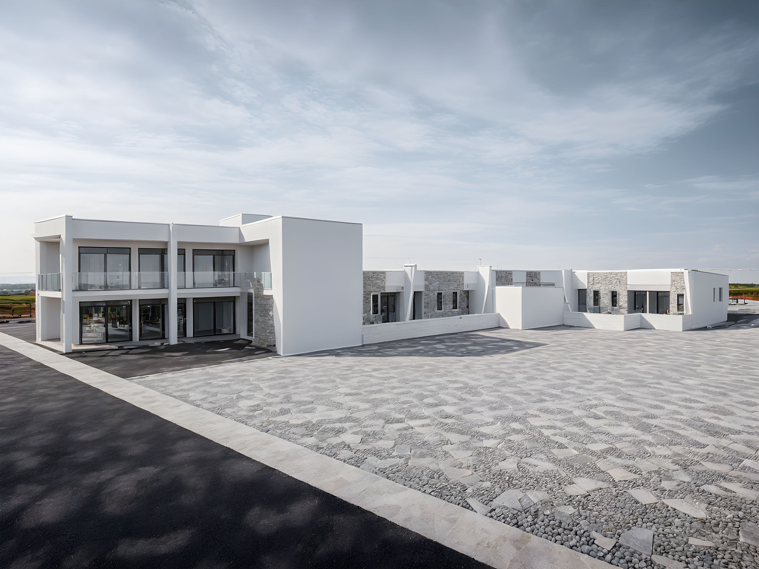 Promptwhite colors on the wall surface,ligts ,urban background,shoping compound,the stone work where it is but improved,copying on the parapet wallin grey colour,asphalt on the road,people walking on th walkway,increase lighting