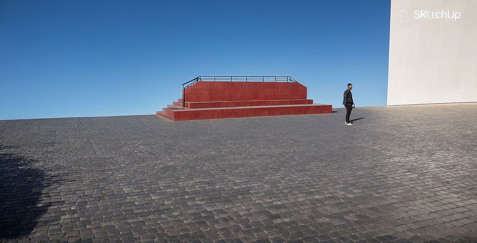 PromptPhoto of a modern architectural platform with tiered levels, featuring a mix of smooth concrete (grey areas in the photo) and the wall made of big, rough, red sandstone chunks (red areas in the photo). The surrounding cobblestone pavement adds an earthy touch, complementing the sleek design. Captured during the day with warm sunlight casting gentle shadows, highlighting the textures. A low-angle perspective frames the scene, emphasizing the scale of the structure against a clear sky while capturing the figures engaged in conversation. Black Steel railing on top of platform