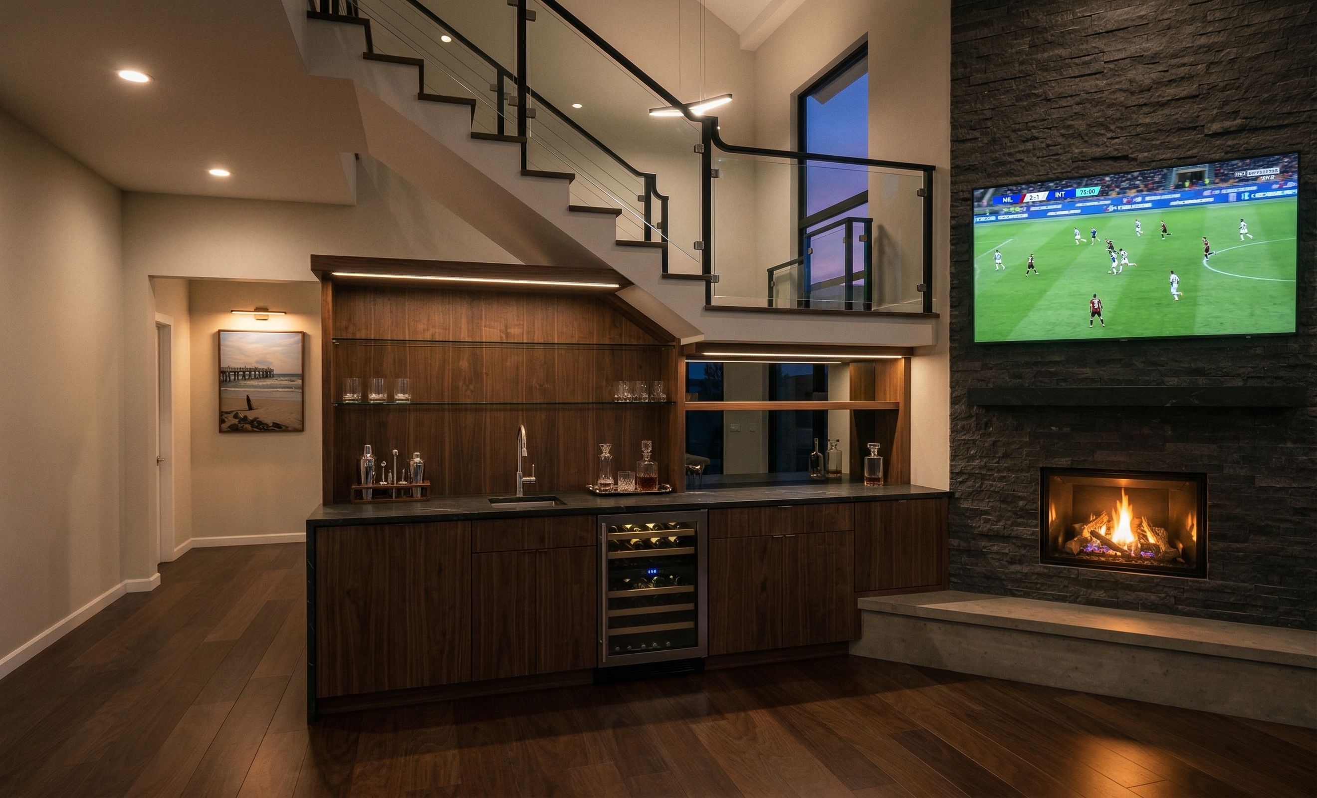 Promptmake photorealistic rendering from this image add wet bar under the stairs next to fireplace as indicated by red area design it so the fireplace and wet bar are connected fireplace is direct vent gas fireplace, show fireplace on burning TV above the fireplace is playing Italian soccer game lights on in the room add light fixtures where appropriate, keep exact camera angle