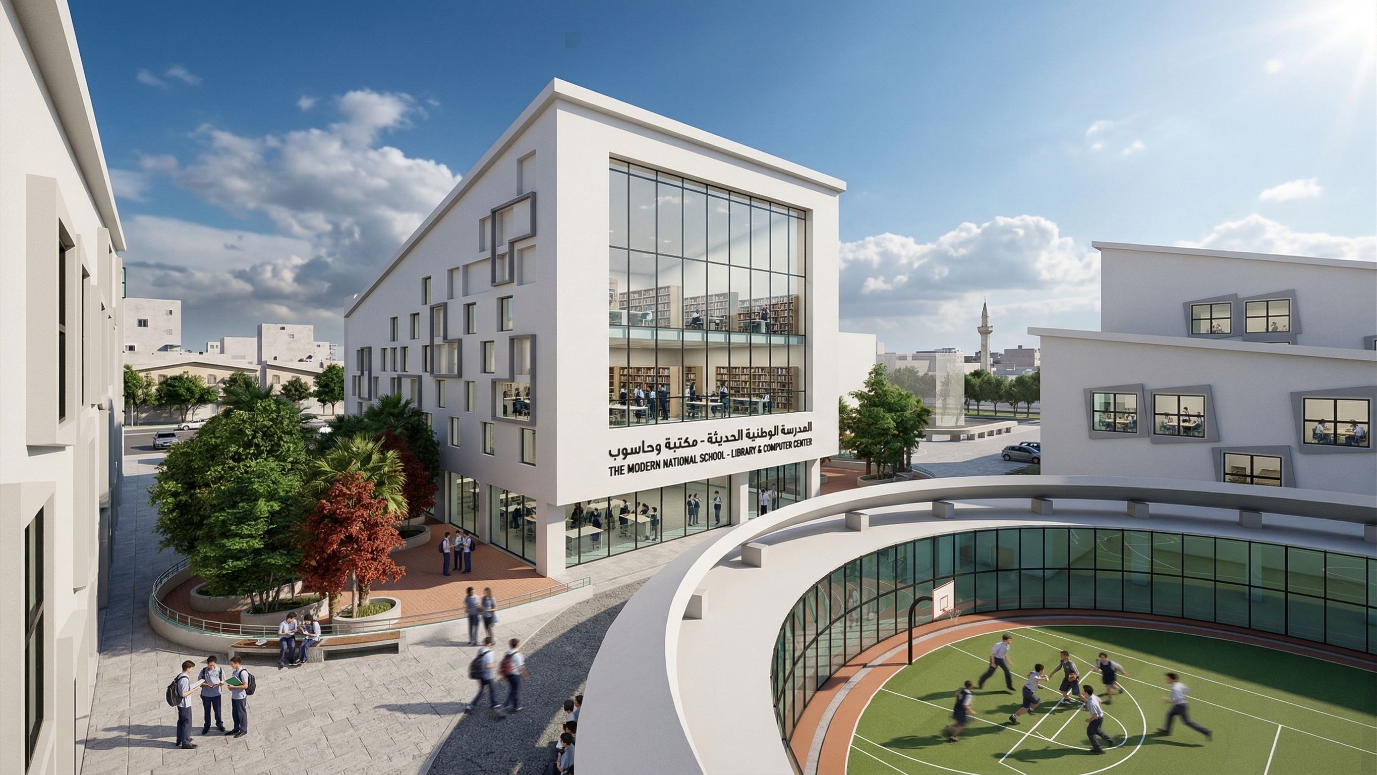 Promptit is the exterior 0f a modern Syrian (ARAB) school and it shows the library and computer 4 stories building add students in the library and under the trees only and in the classrooms and students playing in the sport court, keep exact camera angle