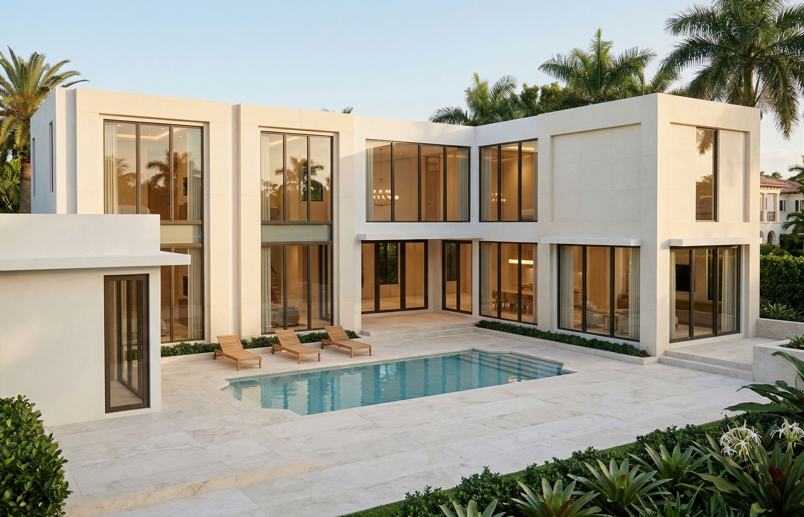 PromptUltra photorealistic architectural rendering using the provided 3D model as the exact base. CRITICAL — DO NOT CHANGE ANYTHING: Do NOT alter massing, proportions, or geometry Do NOT change window or door placement, size, or mullions Do NOT modify hardscape layout or pool shape Do NOT redesign any architectural elements Use the model EXACTLY as given — only improve materials, lighting, and realism STYLE: High-end Palm Beach contemporary Regency residence Luxury real estate photography aesthetic Clean, refined, elegant, tropical-modern LIGHTING (MOST IMPORTANT): Late afternoon sunlight (around 3 PM) Sun positioned to fully illuminate the main façade Bright, even lighting across all visible surfaces Soft, controlled shadows (no harsh contrast) Slight warmth in sunlight (subtle golden tone, not orange) Warm interior lighting visible through windows Overall exposure should be bright, crisp, and balanced — not dark or moody MATERIALS: Stucco Walls: Smooth white stucco with a slightly warm tone Matte finish with subtle natural variation Soft shadow gradients Limestone Surrounds (tan areas): Light cream / pale beige limestone Smooth, monolithic panels NO visible joints or seams Slight edge softness for realism Windows & Doors: Dark bronze / charcoal aluminum frames Thin, modern profiles Realistic glass: Slight transparency Soft reflections of sky and landscape Warm interior glow HARDSCAPE & POOL: Deck / Patio: Light natural limestone paving Honed finish (NOT shiny) Subtle tonal variation (cream / beige mix) Large format slabs with minimal joints Pool: Same exact shape as model Soft aqua-blue water Gentle ripples with realistic reflections Slight depth gradient LANDSCAPE: Lush Palm Beach tropical planting Palm trees, dense hedges, layered greenery Clean, manicured, high-end residential design Natural variation (not flat or repetitive) CAMERA: EXACT same perspective as model image Wide-angle luxury real estate “money shot” Pool in foreground reflecting architecture RENDER QUALITY: Ultra photorealistic Global illumination enabled Soft bounce light Real-world material roughness (no plastic look) Slight imperfections for realism ANTI-CARTOON RULES: No flat white surfaces No overly sharp edges No pure black windows No overly glossy materials No stylized or cartoon look, keep exact camera angle