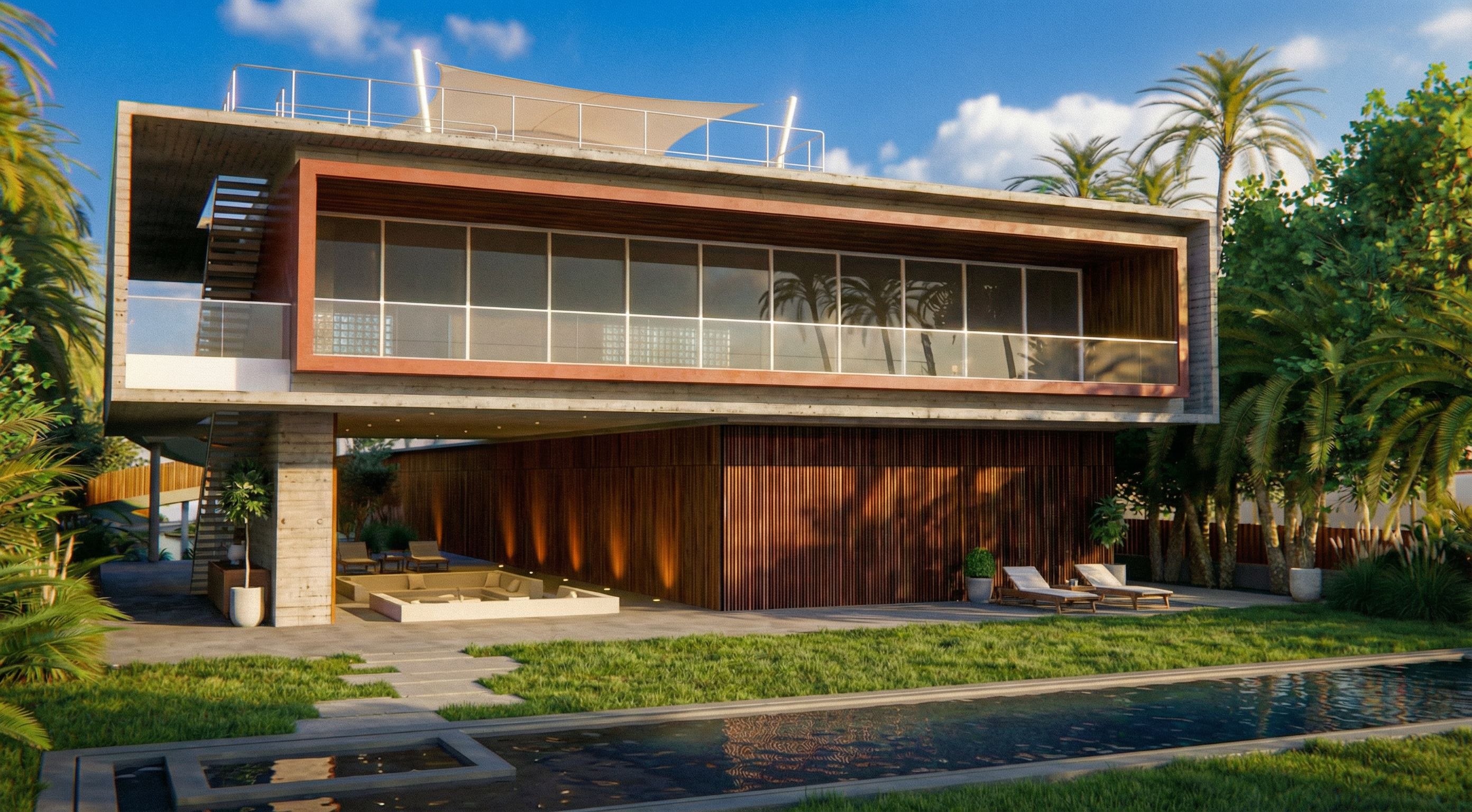 PromptUtiliza las imágenes de referencia sólo como información. Sustituye el acabado sucio del toldo por uno más limpio. Sustituye el césped por uno más continuo y similar a las imágenes de referencia. Genera un efecto de luces y sombras mas marcado. haz que el agua de la piscina tenga reflejos más naturales y realistas. Haz el camino de baldosas más parecido a las imágenes de referencia. Genera más realismo en las palmeras. Añade un cielo azul con pocas nubes naturales y bien definidas., keep exact camera angle