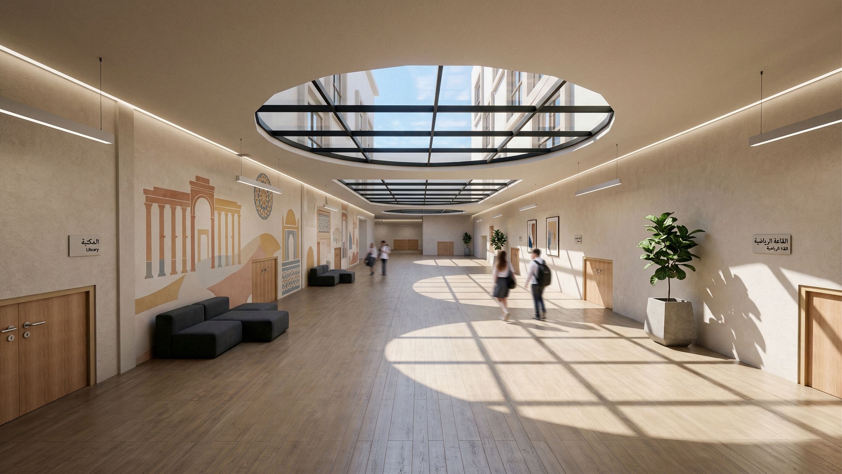 PromptPhoto of an expansive modern interior space of a Syrian high school corridor designed for versatility, featuring high ceilings and an overhead skylight that bathes the area in natural light. add murals on the walls . The environment conveys a minimalist aesthetic, with unique shadows cast by the skylight. Captured from a low-angle perspective to emphasize the spaciousness and architectural detail, lens specifications highlight clarity and depth, creating a sophisticated atmosphere that draws the viewer into the space. enhance materials and do simple design make the doors and people in relevant scale , keep exact camera angle
