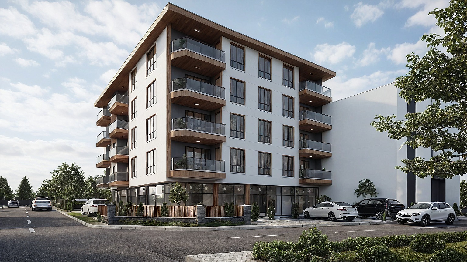 Promptrealistic render,modern face on building,use grey white and wood on building