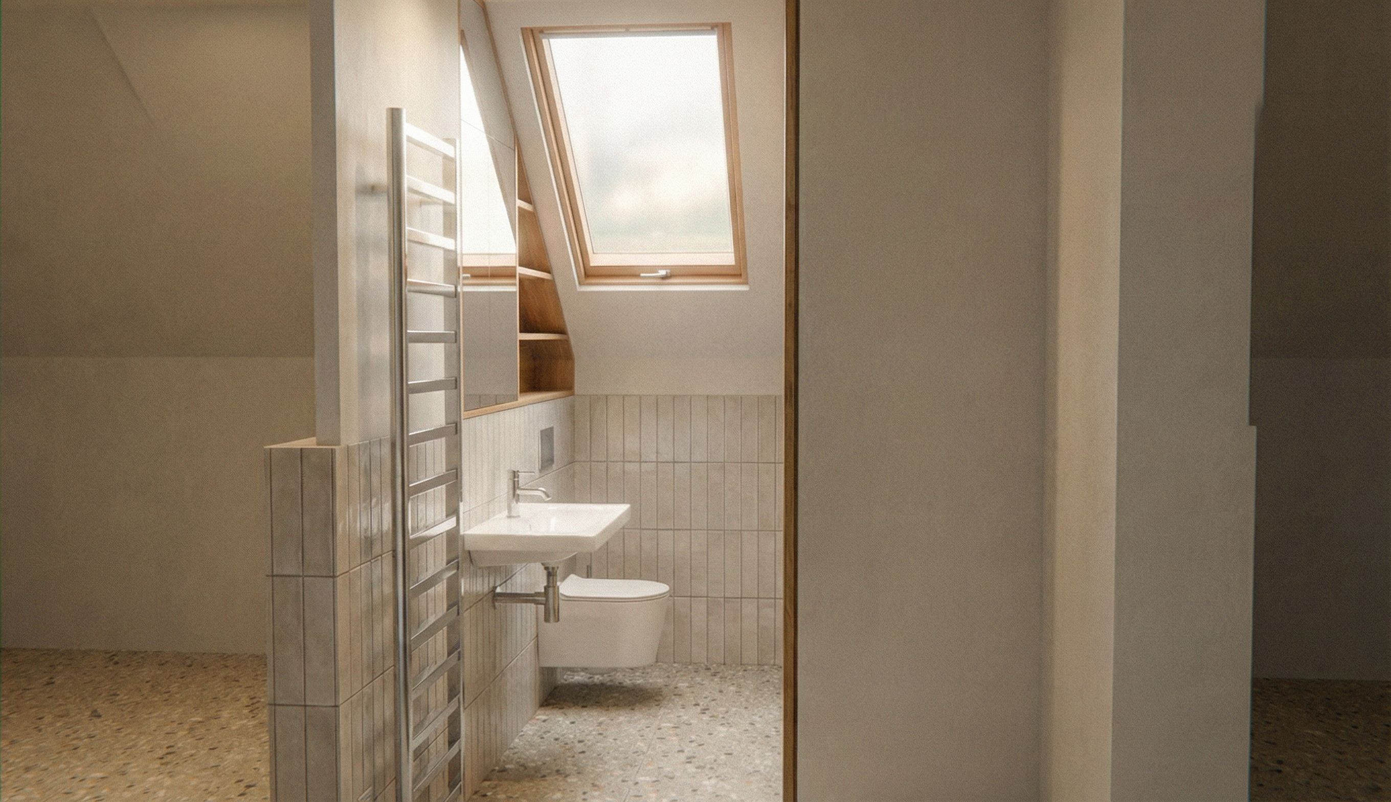 PromptBathroom interior render. Follow the reference drawing exactly. Preserve all materials and finishes. Floor: terrazzo in warm beige tones. Wall tiles: Equipe Stonella Silver Breeze shifted toward a soft beige / warm neutral оттенek. No color saturation, no strong contrast. Photorealistic look. Soft, warm diffused lighting. Natural light mixed with gentle artificial light. Calm, pleasant atmosphere., keep exact camera angle