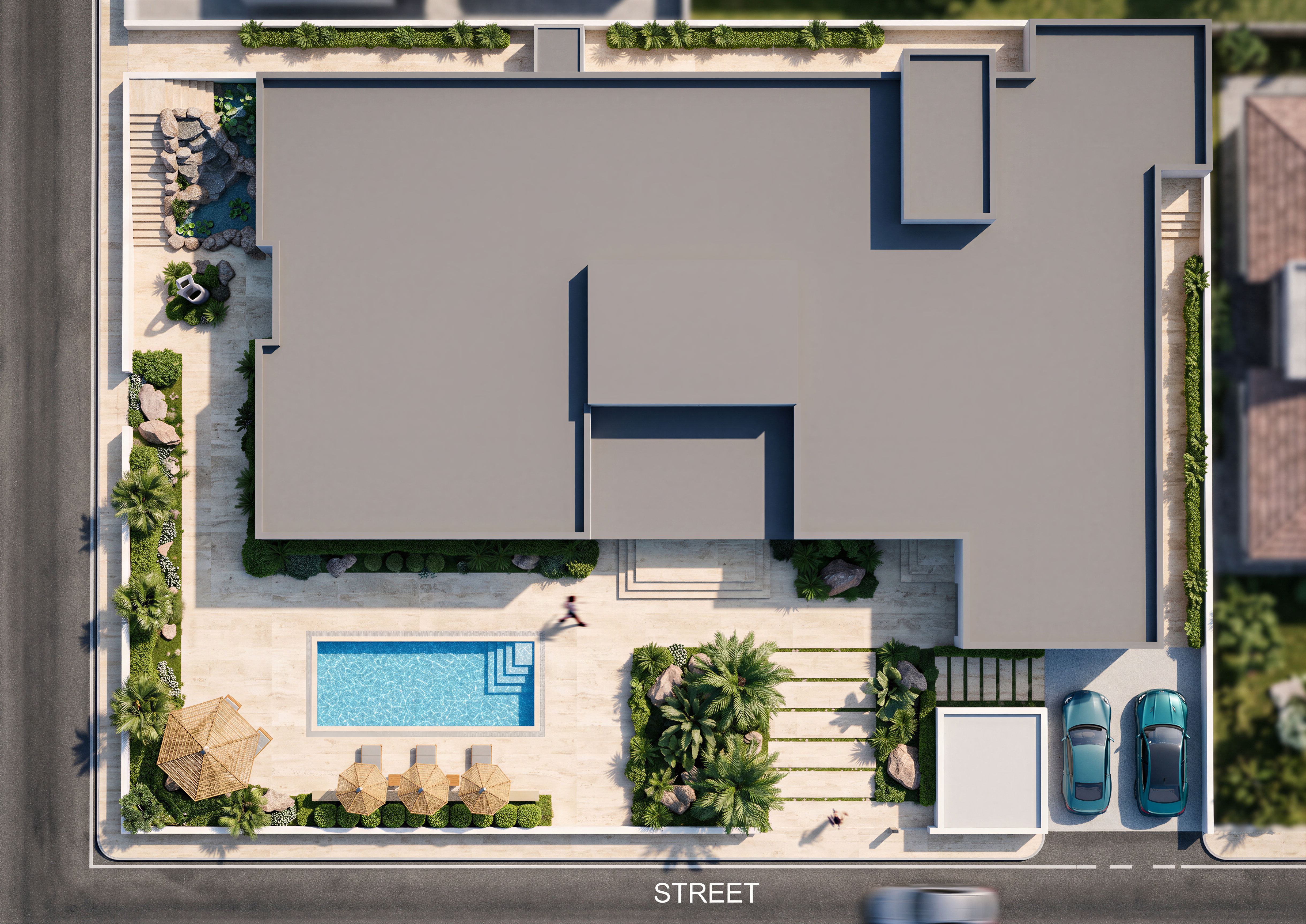 المخطط المرفق هو الموقع العام لفيلا سكنية وفي المقدمة مسبح وعلى مع اسرة بحر بعدد 3 مع مظلات من البامبو بجوار الاسرة والمطلوب افضل اخراج واقعي مع الظلال ولكن يجب الالتزام بالتصميم الجديد دون تعديل في المقاسات او الاشكال او مكان المسبح ومادة اكساء الممرات هي رخام الترافرتين ولا احتاج ان تكون الاسقف قرميدية , keep exact camera angle