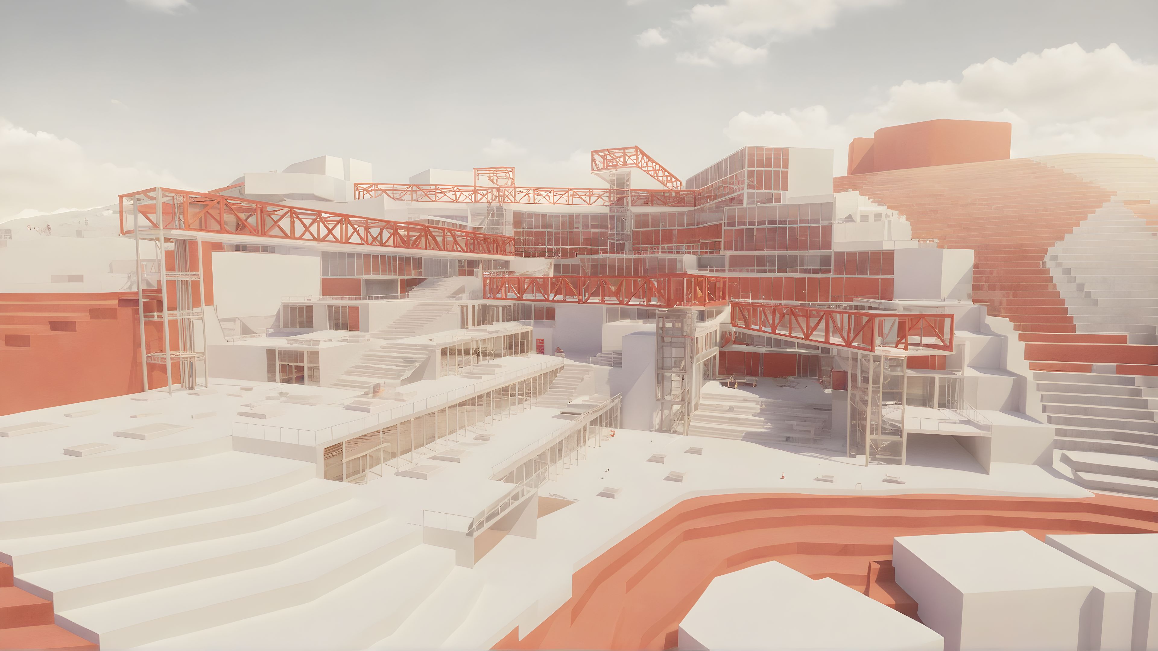 Promptmountain, stairs, truss bridge, highrise elevator, steps, terrace architecture, sunset sky