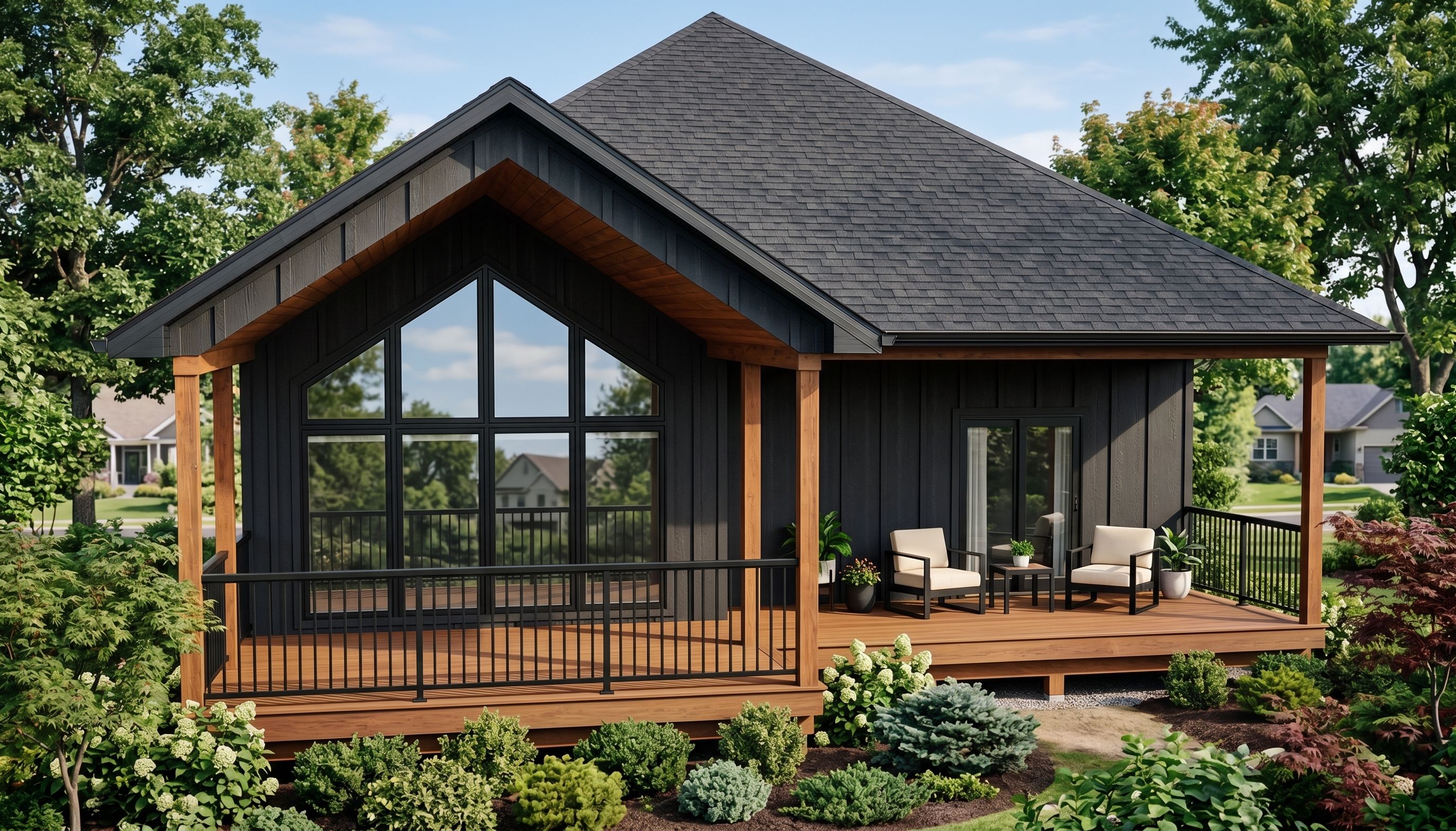 show a raised covered deck with railing and black spindles, show patio furniture and a perfect backyard oasis, house shown in a commuinty with neighboring homes , keep exact camera angle