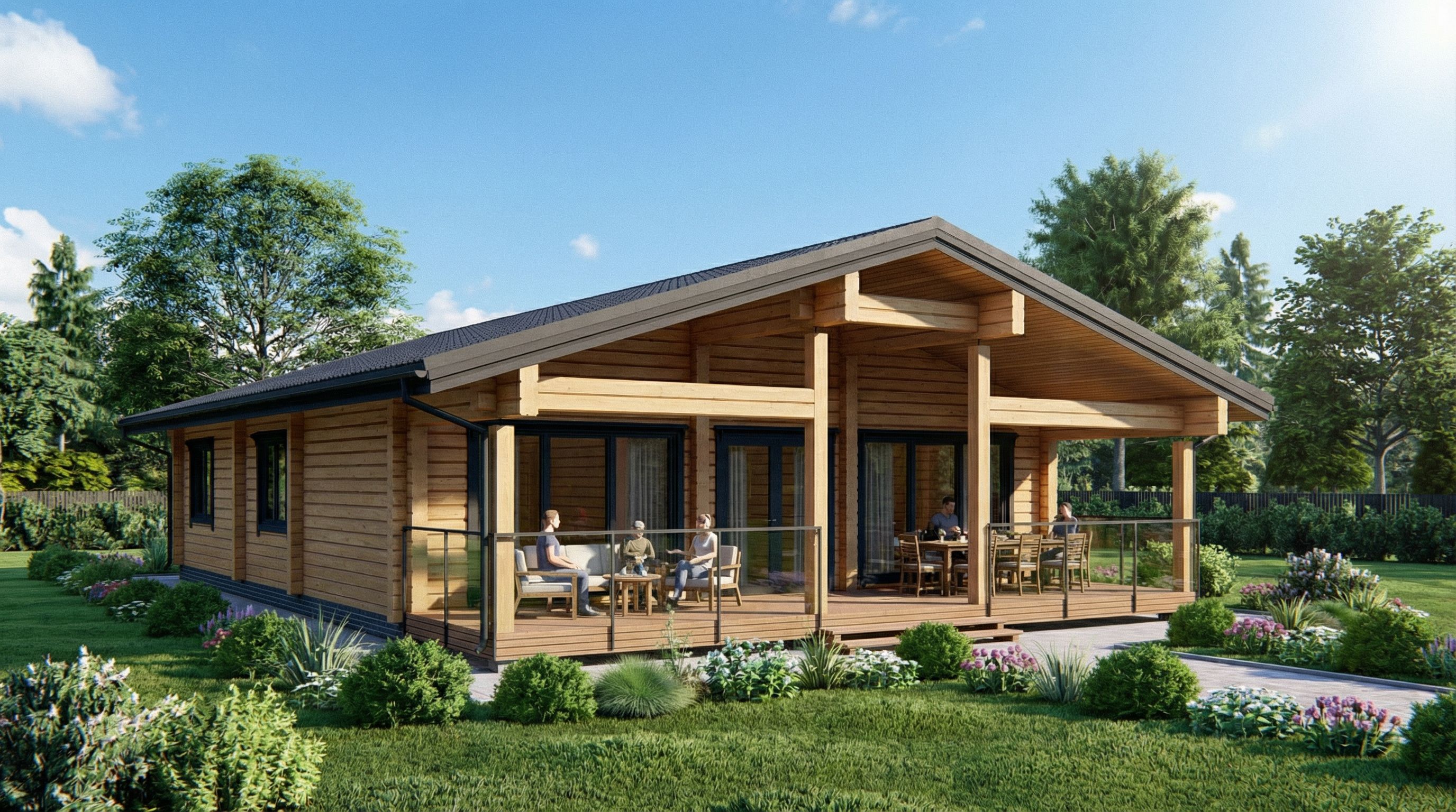 Prompta wooden house made of glued laminated timber with a dark roof and dark window frames, keep exact camera angle