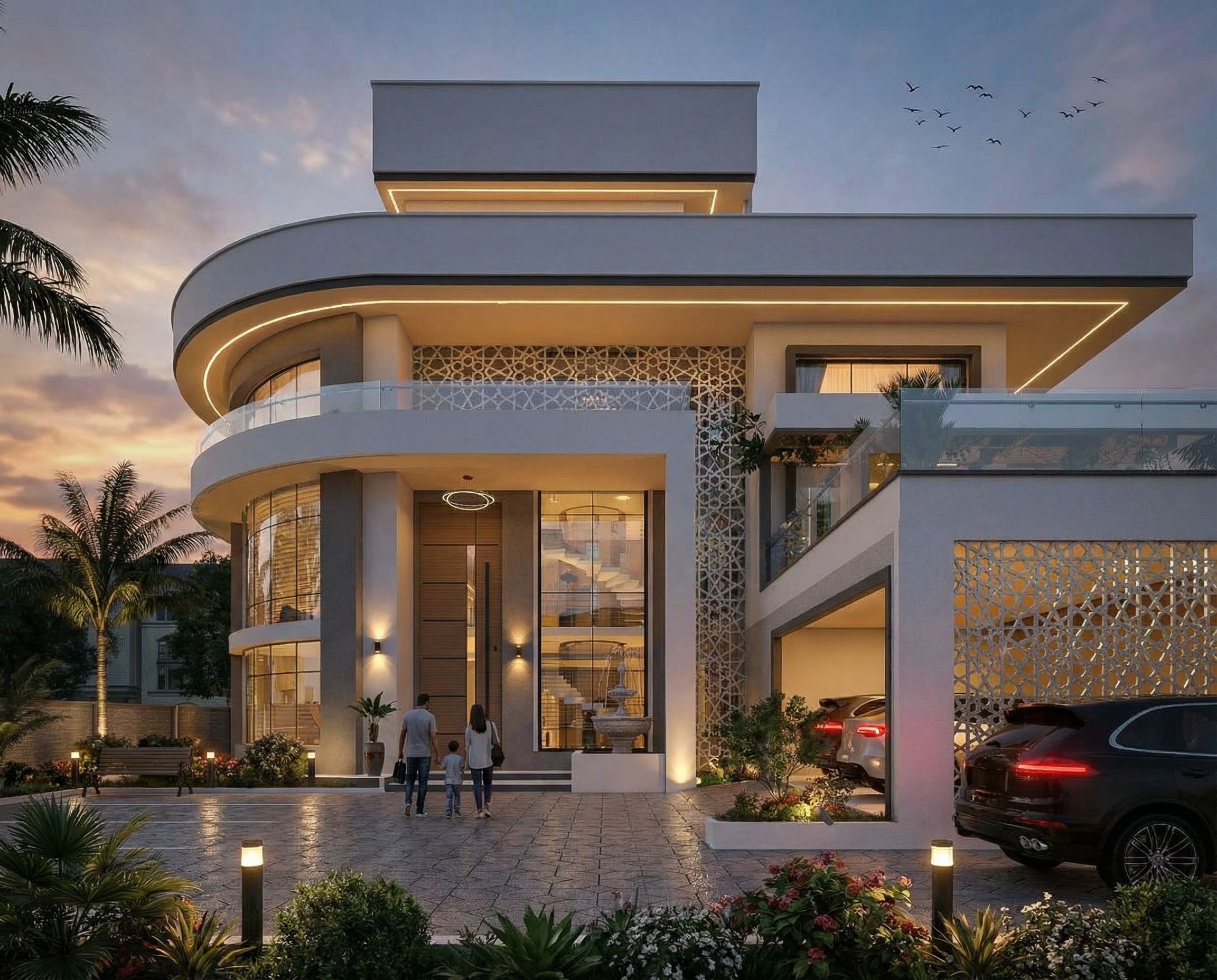 architectural exterior rendering, render this photo into photorealistic rendering, Warm summer morning sky with birds in the sky. Turn on the lights in the house and include some exterior lighting ideas. Include some landscaping., keep exact camera angle, dusk atmosphere with soft lighting, including people, vehicles, greenery and vegetation, trees, street furniture, high quality, professional, detailed scene