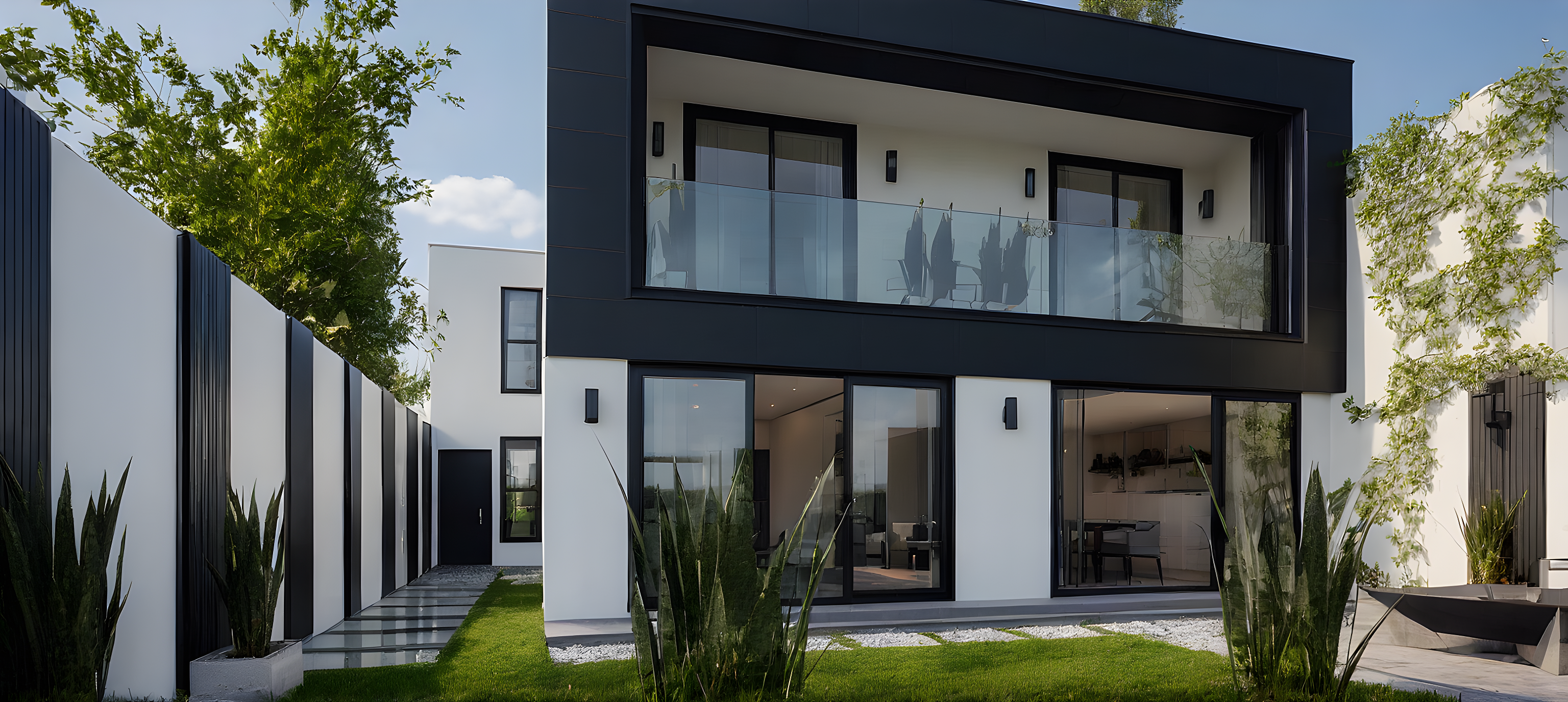 imagine a stunning visual of a modern villa, clean lines, railing on balcony is made of tempered glass and stainless steel, the frame its made of dark slate and sub-frame is a black steel beam, Backyard have concrete tiles and tiny grass, realistic glass and reflections, perimetral wall is made of white plaster and wall panels, frame of windows and sliding doors are black aluminum.