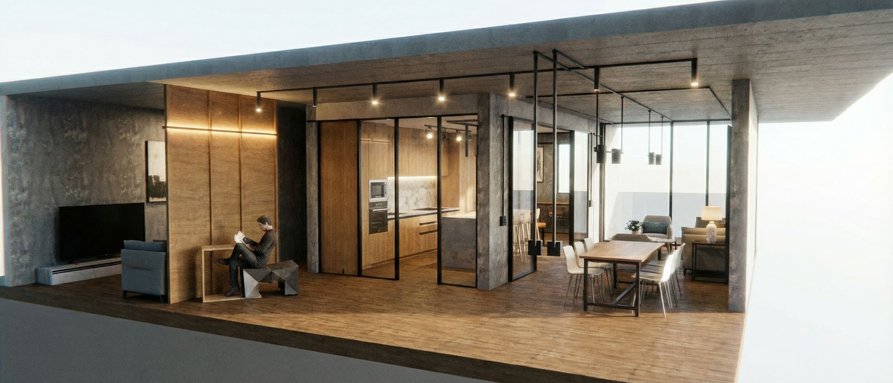 PromptEstilo industrial, no cambies distribución, suelo madera medio, muros grises hormigón visto , cocina de robe, chic, elegante arquitectónico , keep exact camera angle