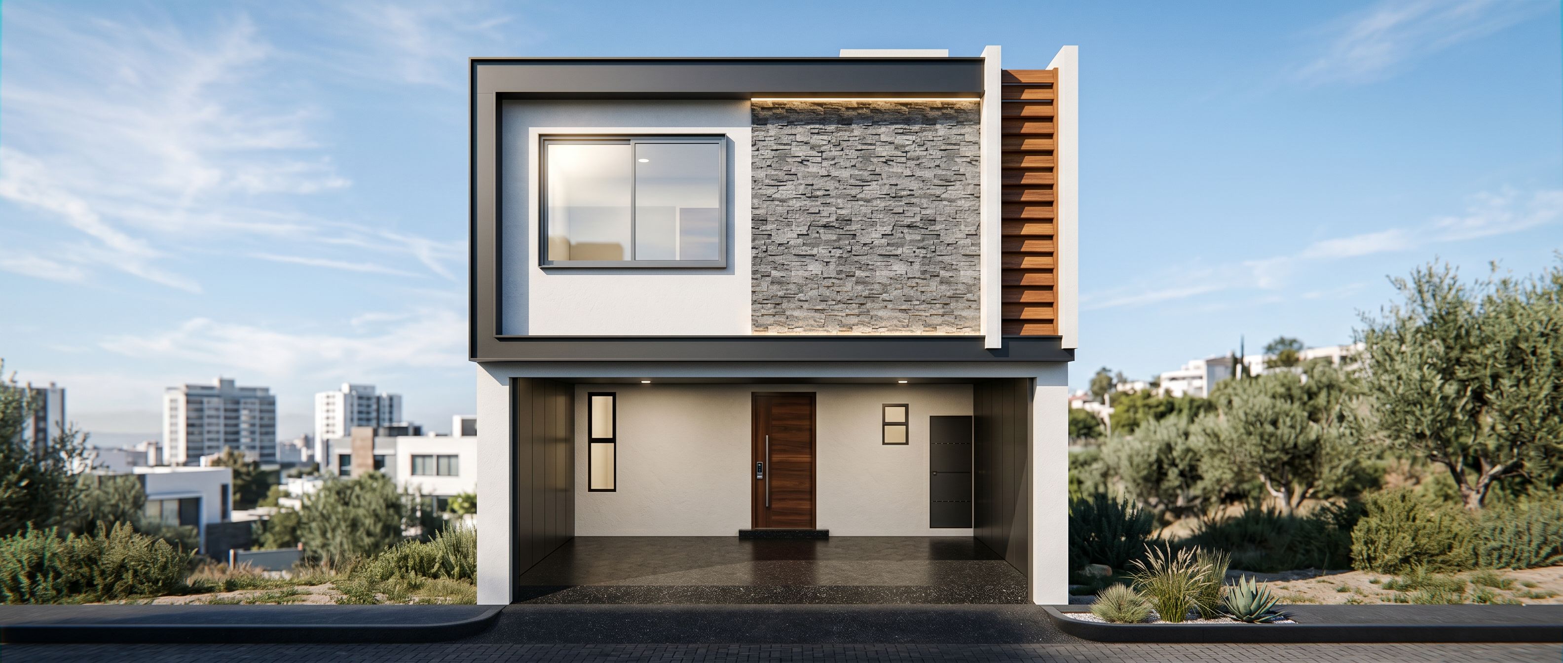 Photo of a modern two-story residential building, showing an elegant facade with a mix of stone cladding texture and smooth white walls. Highlight the large windows to bring in natural light, Set against an urban backdrop of subtle greenery. The scene captures the bright light of day, creating soft shadows and vibrant highlights. View from a slightly elevated angle to emphasize height and design features, using a wide-angle lens for a wide perspective. Maintain the exact camera angle. improving the quality of materials and adding lights to the façade, keep exact camera angle