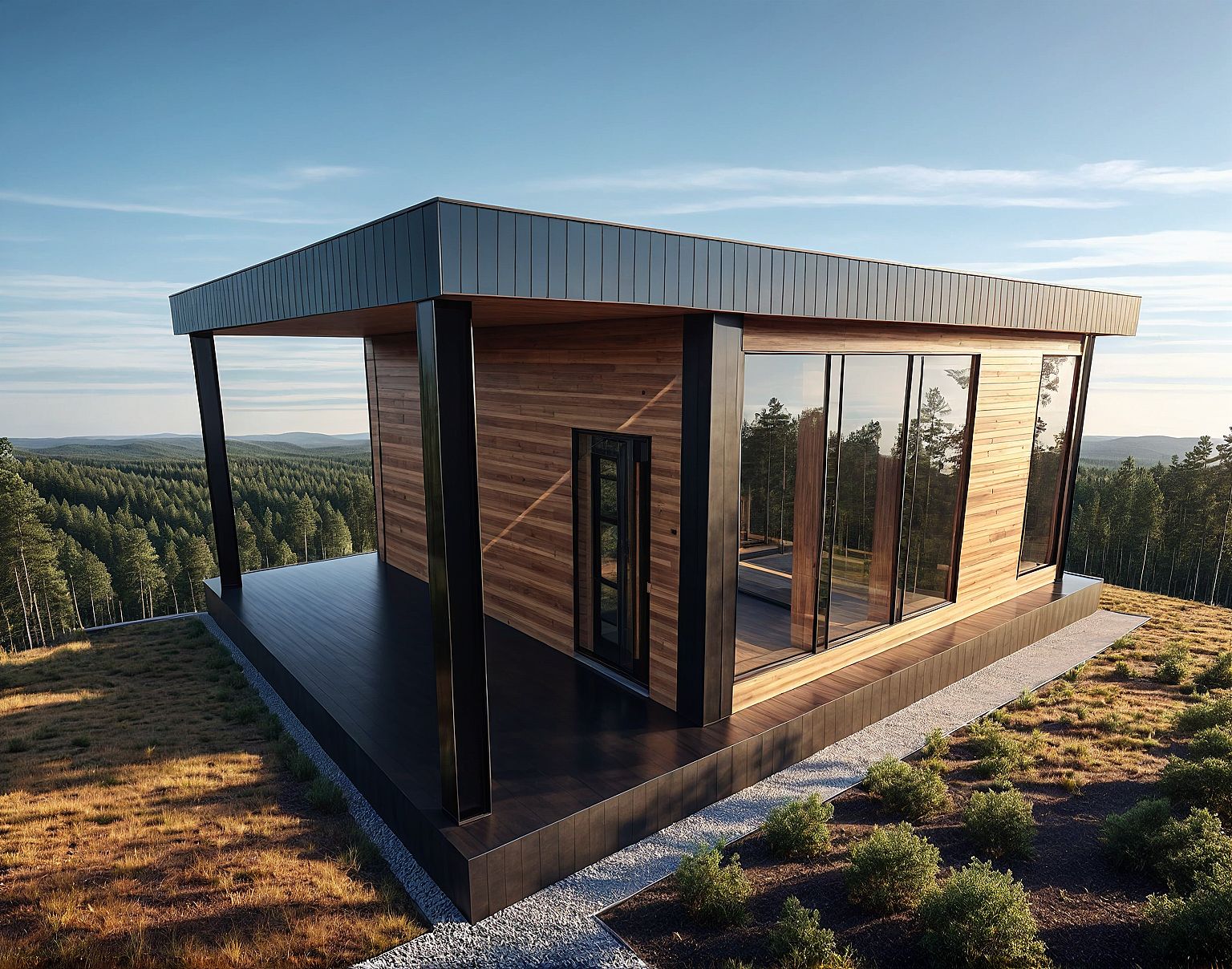 PromptModern minimalist house, wooden panels, glass windows, straight lines, geometric shapes, iron sheets and wooden planks, surrounded by forest.