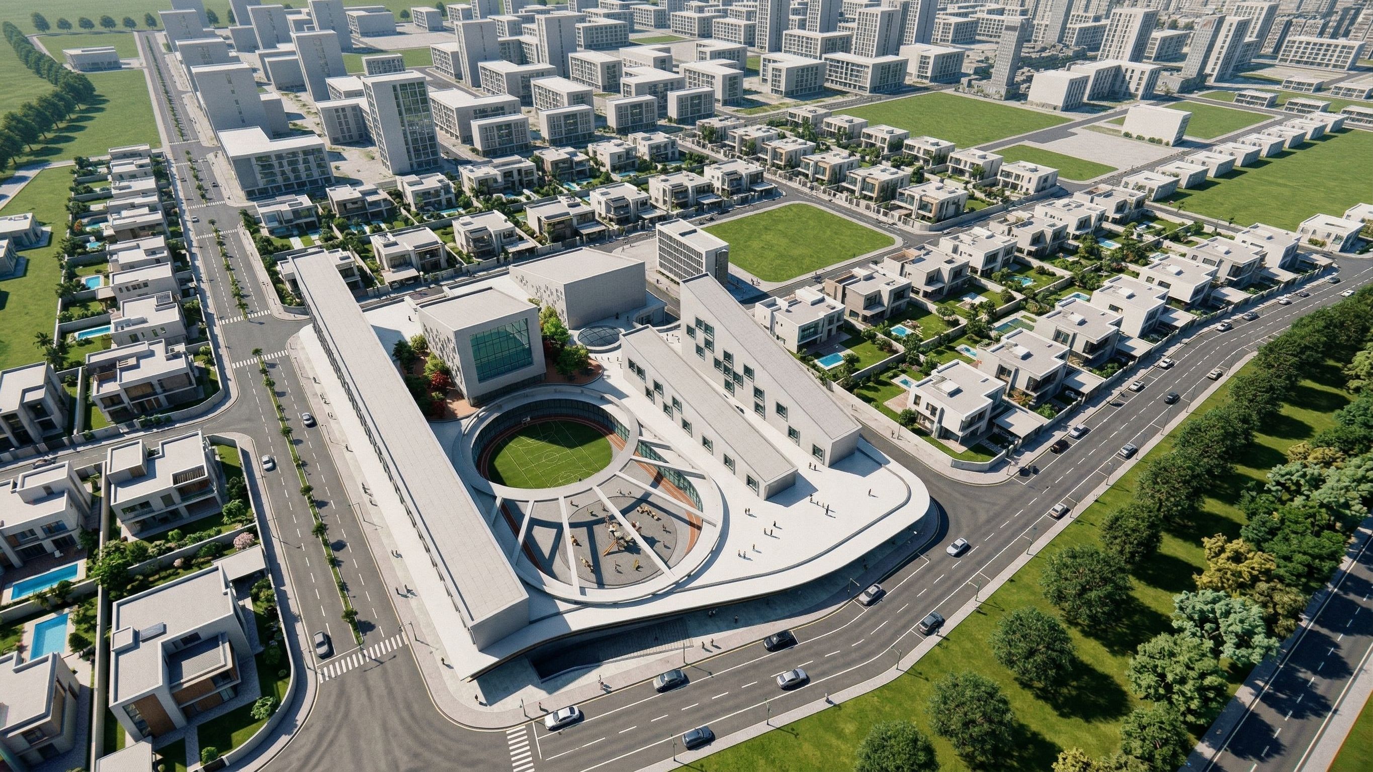 PromptTHIS IS A BIRD VIEW SCENE OF A SECONDARY SCHOOL DESIGNED IN A MODERN WAY..