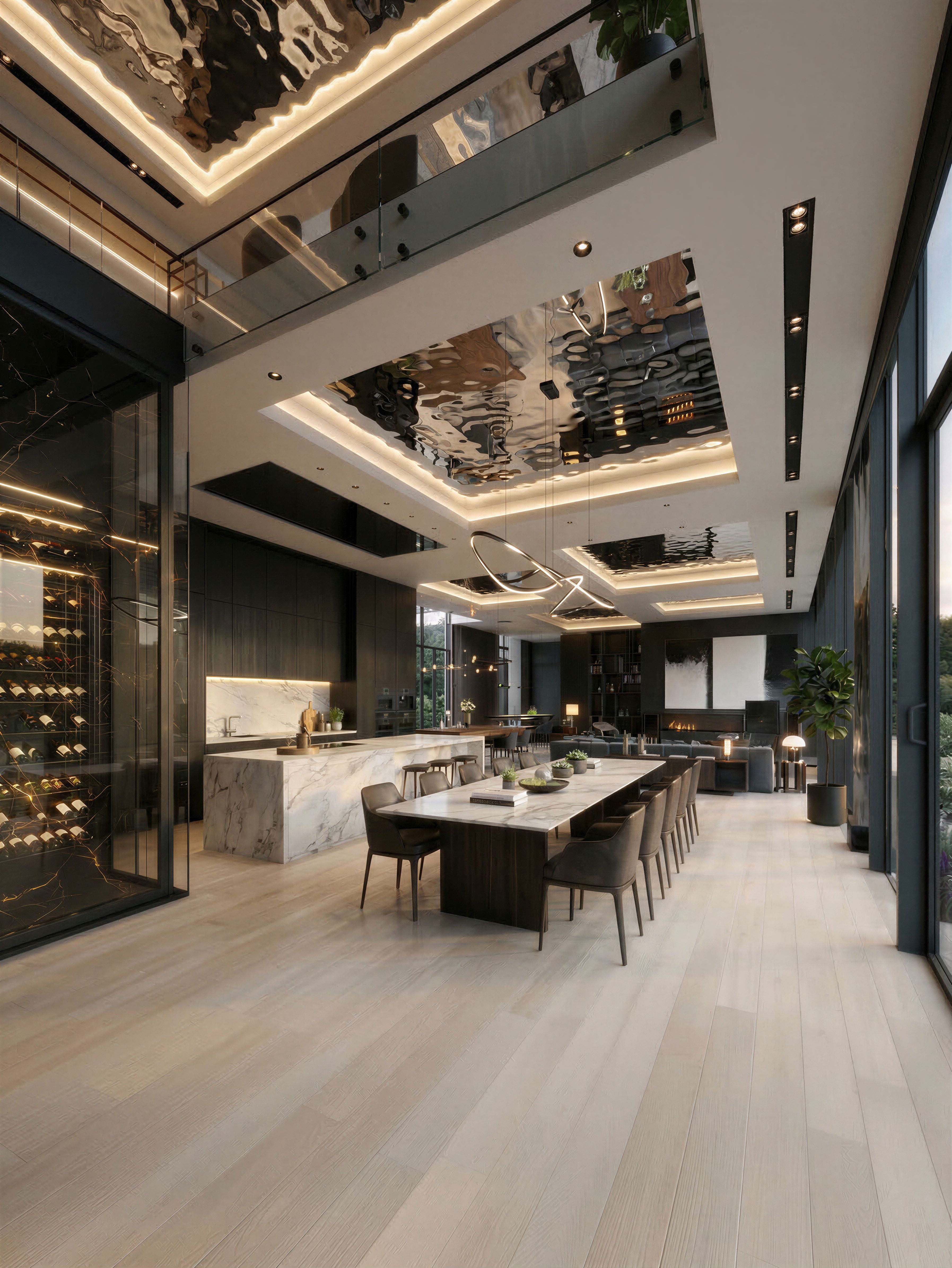 redefine este espacio y transfórmalo a un estilo refinado y sofisticado de alto standing con un estilo italiano de concepto moderno. depura las líneas como lo haría un fotógrafo profesional del interiorismo. Utiliza en el mobiliario de la cocina los muebles de madera de roble negro mate y la carpintería metálica negro mate. utiliza para el interior de los falsos techos los paneles ondulados de espejo de las imágenes de referencia., keep exact camera angle