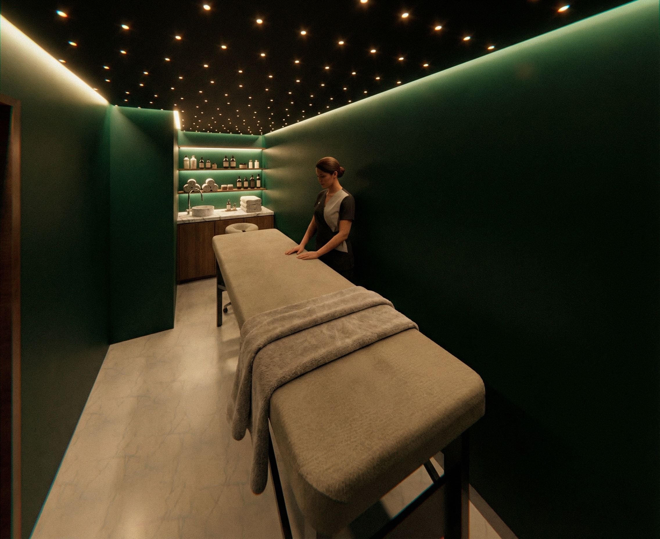on this picture there are small circular holes on the ceiling. These are for small LED lights to create a brim atmospehre. The walls are going to be dark emerald green with satin kinda texture. The counter top is white marmore and below the whole unit except for basin and the tap are dark oak. The corners and edges of the ceiling has also opening to have horizontal lighting aswell. Add bottles on the shelves and a covering towel on the massage tale with a masseuse next to it. , keep exact camera angle