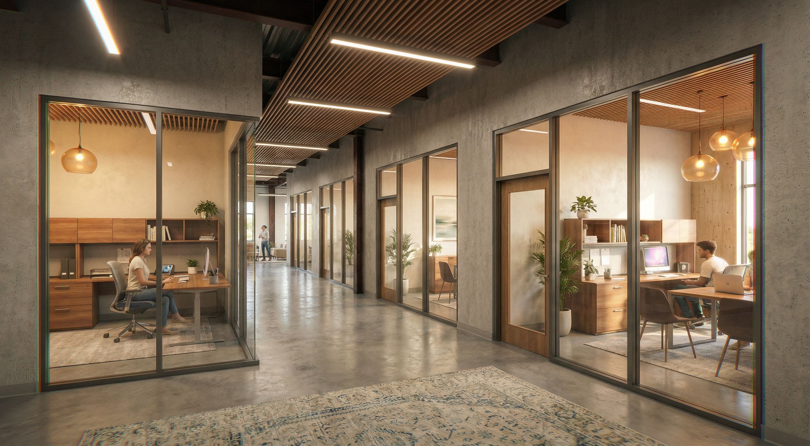 transform this hallway into a hallway of offices with glass doors that are fully furnished and fit the modern wood aesthetic that the reference images provide