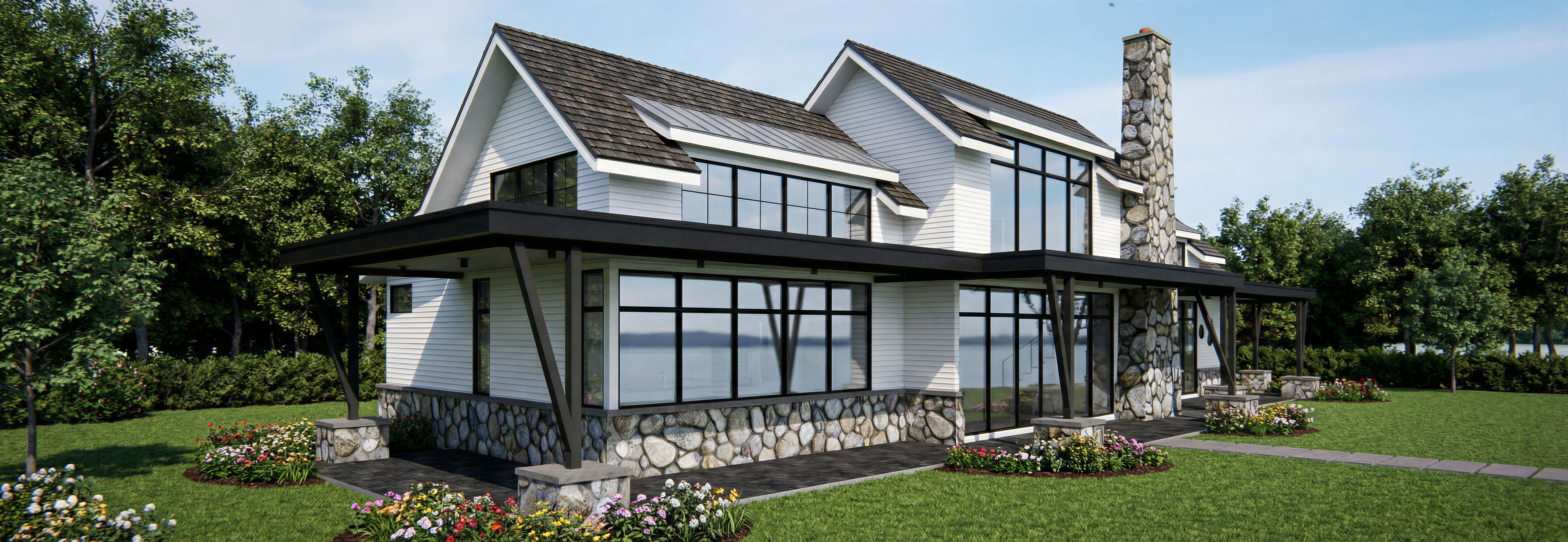 Make photorealistic rendering of the house, add trees on the left and right behind the house, replace light brown gravel spaces with flower beds, lawn in the front and left side, high pitch roofs are darker cedar shake, lower porch roof is black flat membrane roof type, no standing seam on the porch roof, upper roofs above four square windows are standing seam metal, wall siding is clean bright white mitered lap siding per Reference Image 2, porch floor is darker paver, windows subtly reflecting lake per Reference Image 1, keep exact camera angle, keep exact camera angle, keep exact camera angle , keep exact camera angle