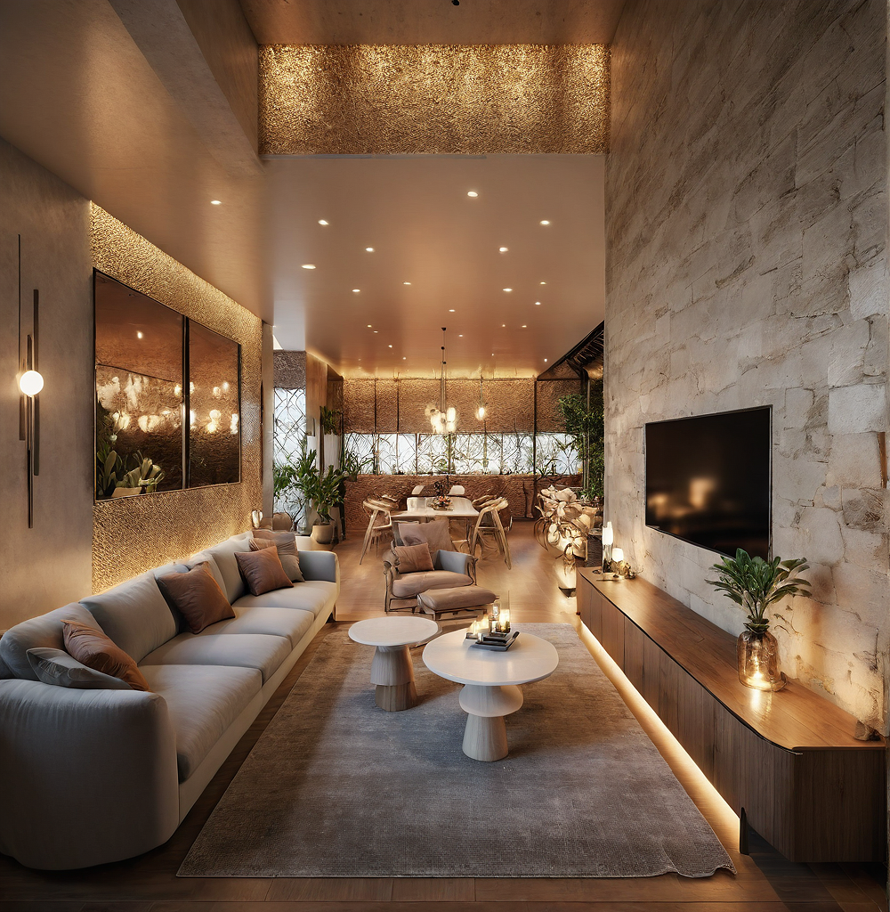 a realistic image of a modern living room, in a beautiful sunset
