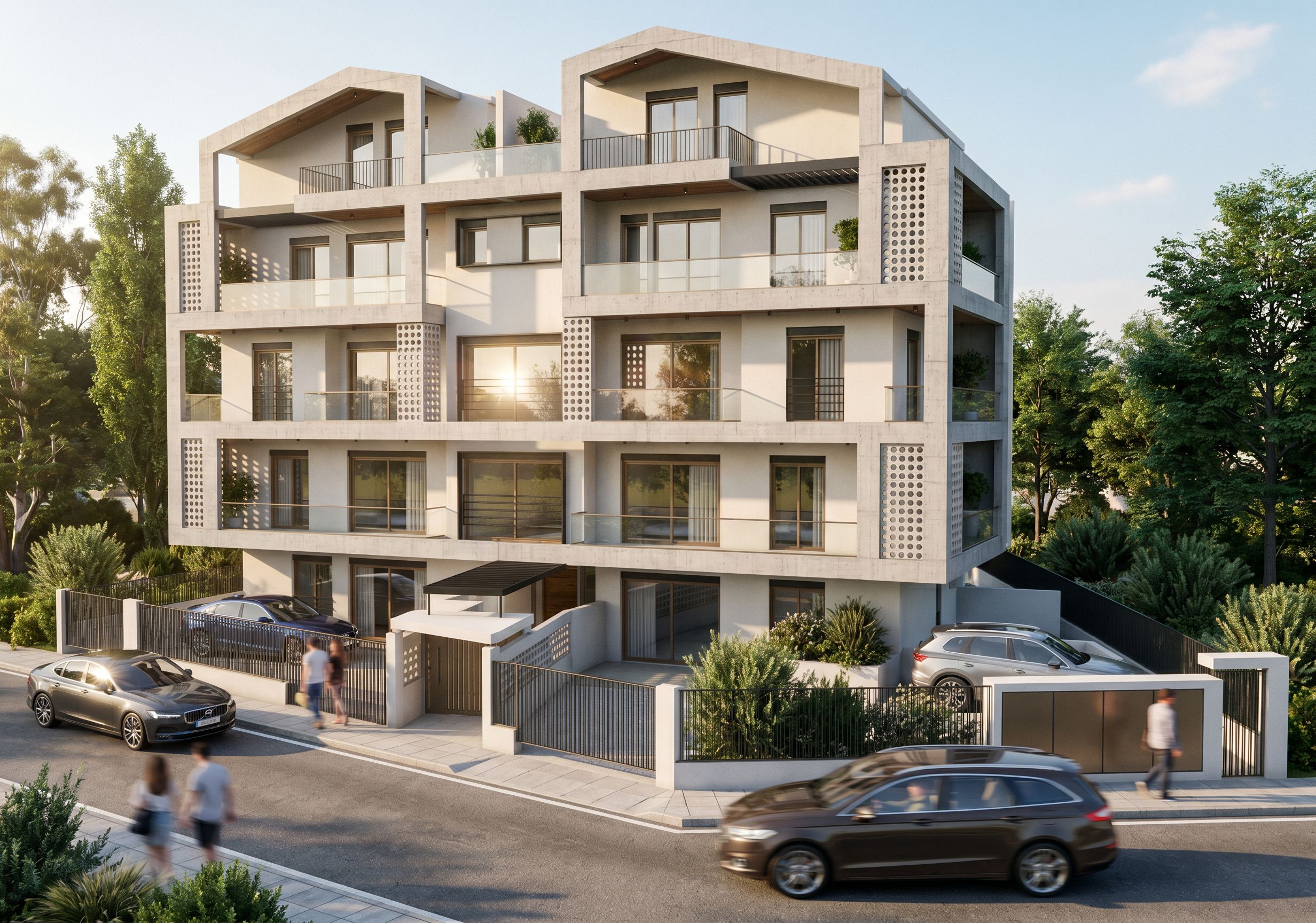 Prompt Modern block with large bronze windows, materials such as concrete,vanilla plaster,metal, Cement Breeze Blocks surrounded with greenery. Put at the left side in front of the left window a car . Also put at the left side of the building a car. Put at the right side in front of the big window a car and add besides this car a few bushes. Put in front of our building a road with a car. , keep exact camera angle