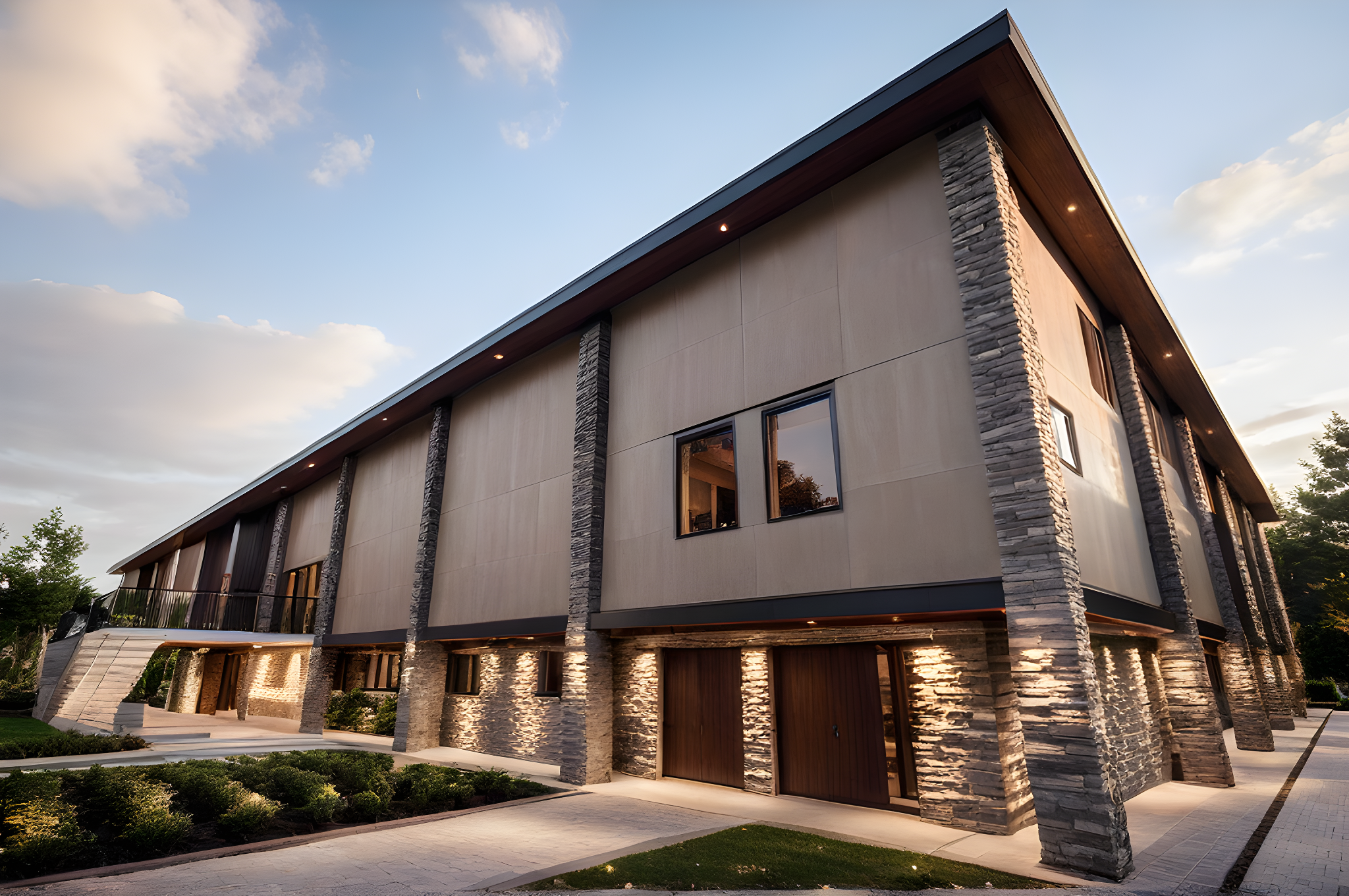 PromptThe top half of the building has light brown aluminum panels. The columns are made of stone and the bottom level has two brown double doors. There is a garden in the front yard.