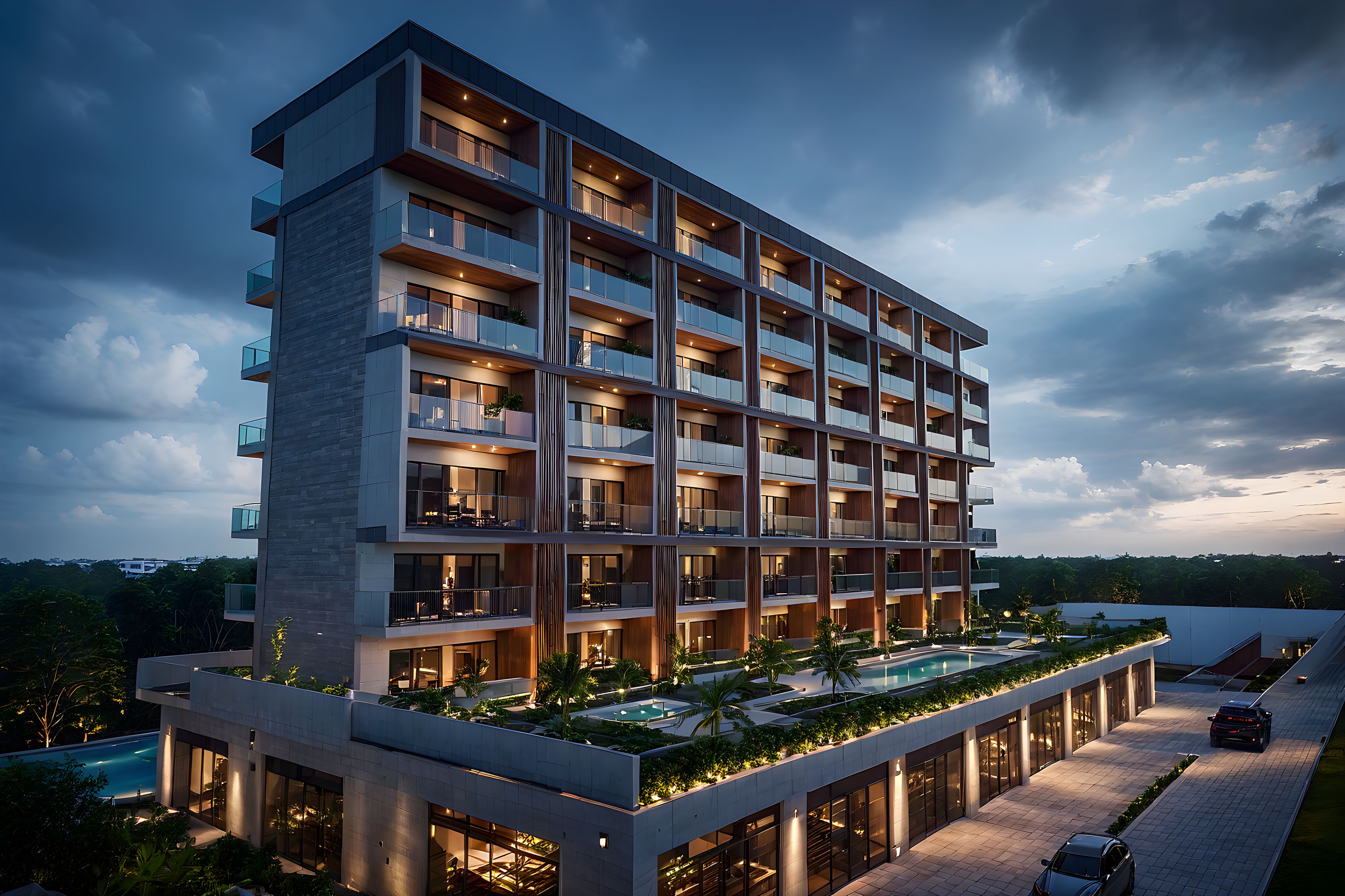 PromptPhoto of a modern multi-story residential building with a sleek facade and balconies, featuring concrete and glass materials, highlighted by warm wooden accents. Surrounded by lush greenery and a swimming pool on the podium level, the environment blends urban and natural elements. Evening lighting creates a soft glow, accentuating the structure's textures and design features. Captured from a low angle with a wide lens, allowing a dramatic perspective that emphasizes height and accessibility.