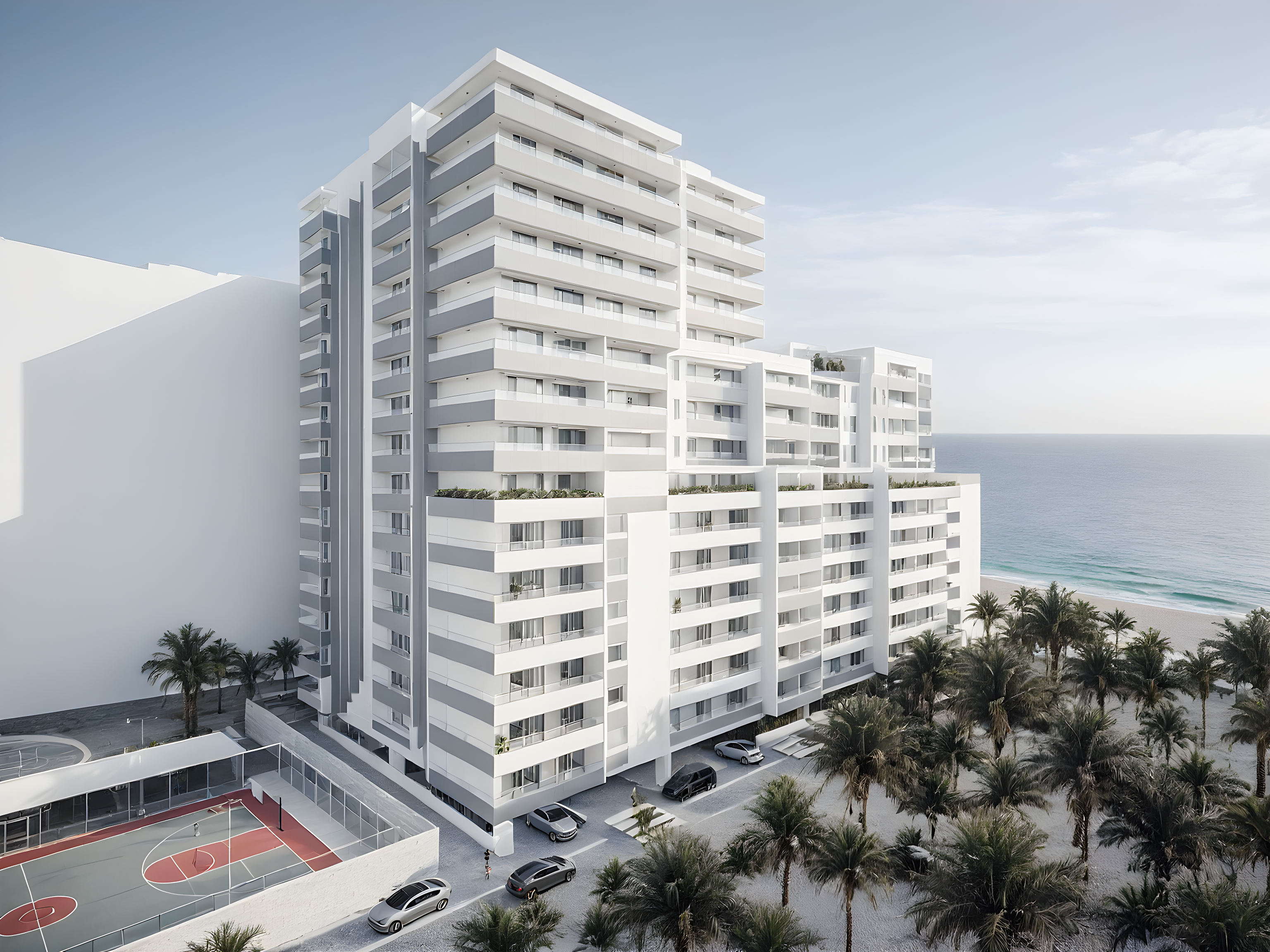 Promptcolored basketball court, white and light grey modern hotel, everything else grey