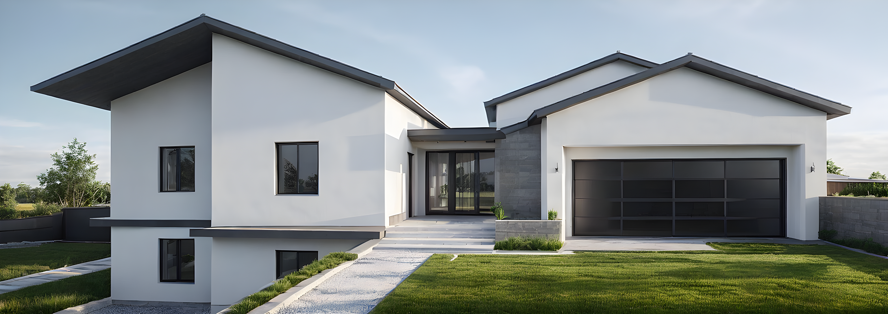 modern gray and white house with grass