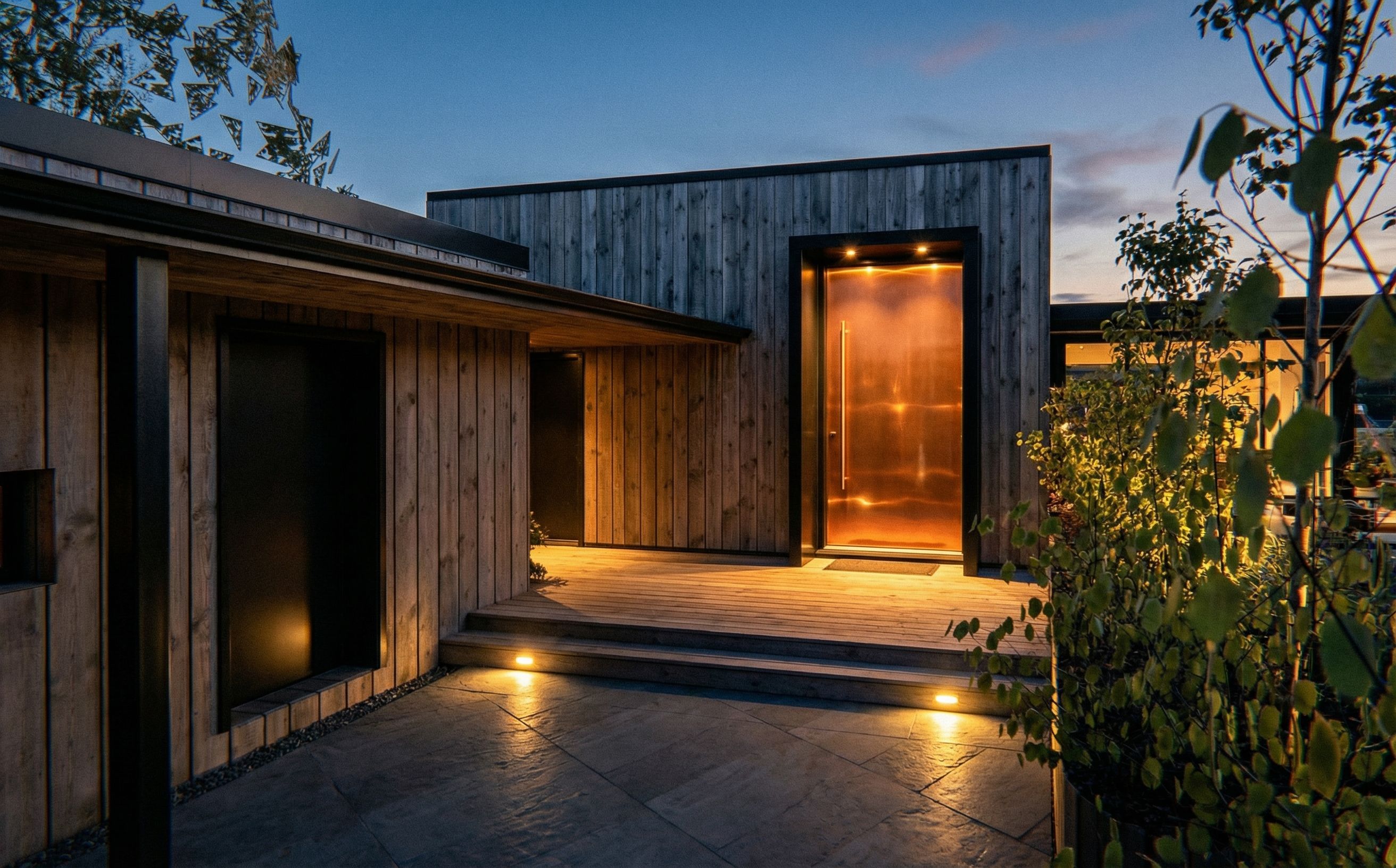 Promptshiny copper door with black frame. only the door in copper.. Entrance with led spot lights integrated in the floor on both sides. Spot lights inside top of door frame. Lights leading towards entrance.