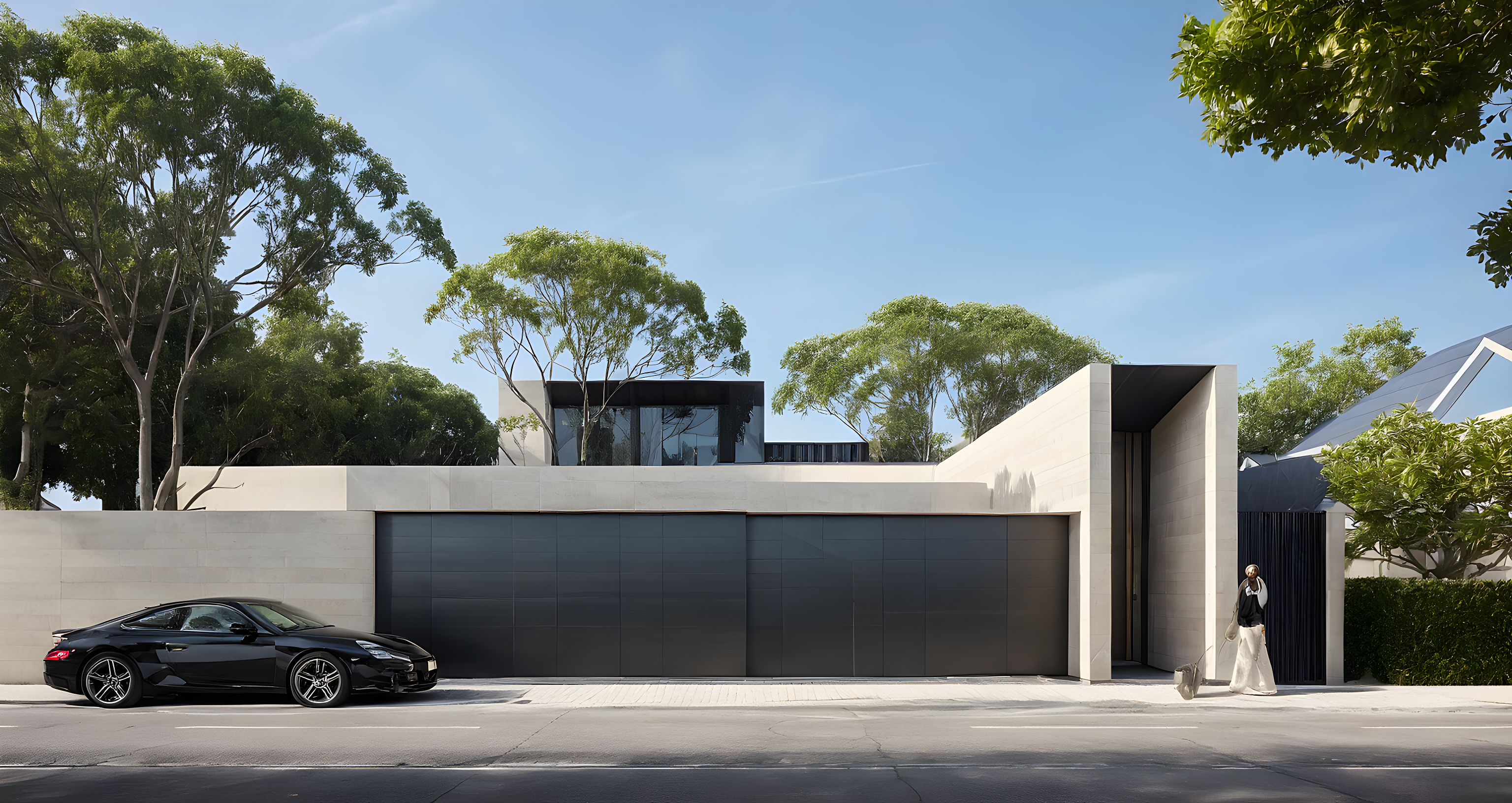 Promptbright day vibrant environment minimal design blackened raw steel facade smooth beige limestone keep road surface without grass and plants